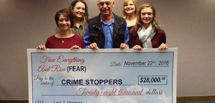 The Heimer family presented their $28,000 to the Crime Stoppers organization Tuesday afternoon during a media event.