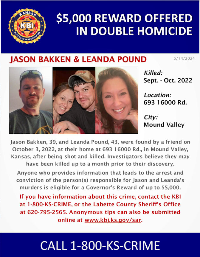 The Kansas Bureau of Investigation and the Labette County Sheriff’s Office have been investigating the murders of 39-year-old Jason M. Bakken and 43-year-old Leanda R. Pound, of Mound Valley, Kansas, since they were discovered deceased in October of 2022.
