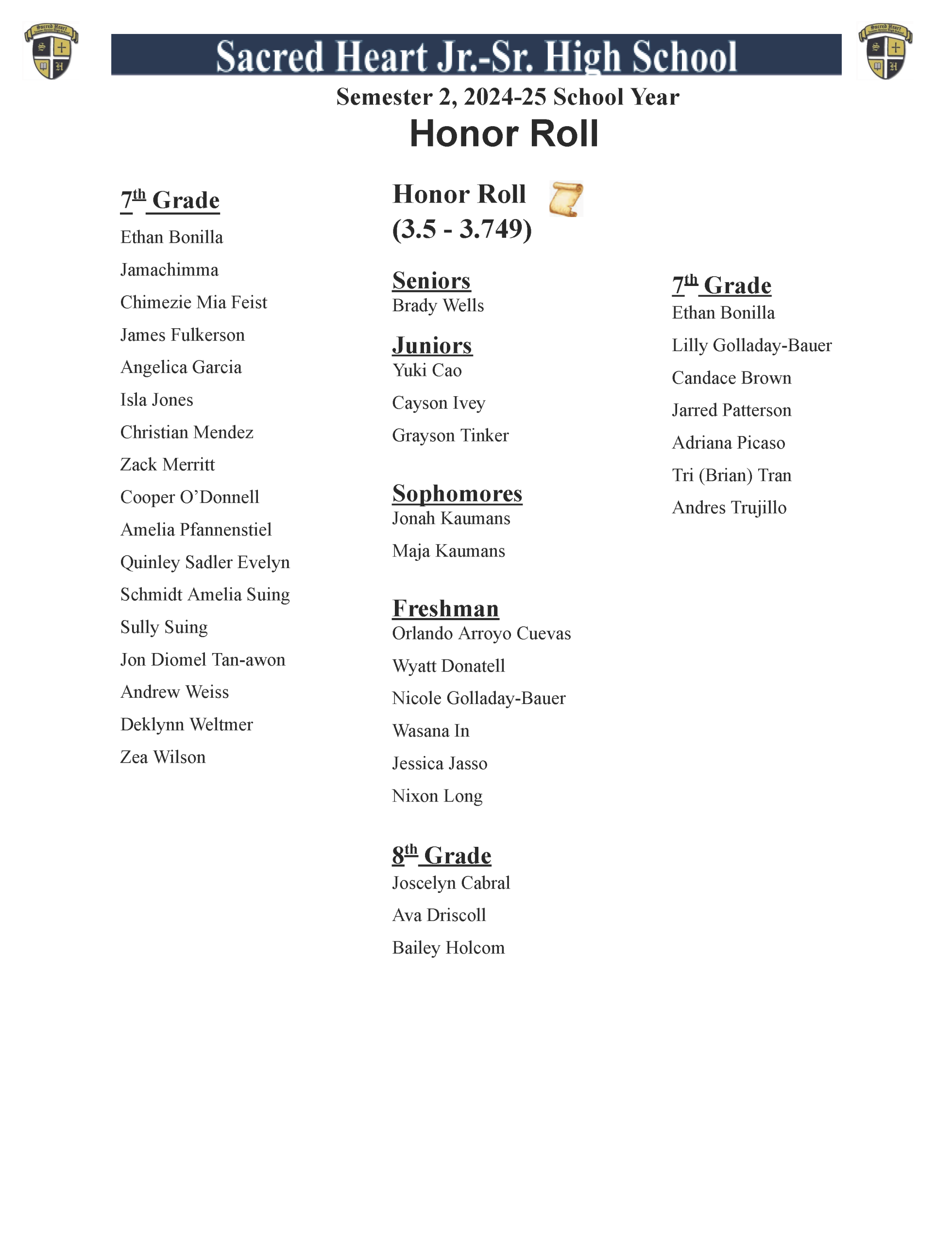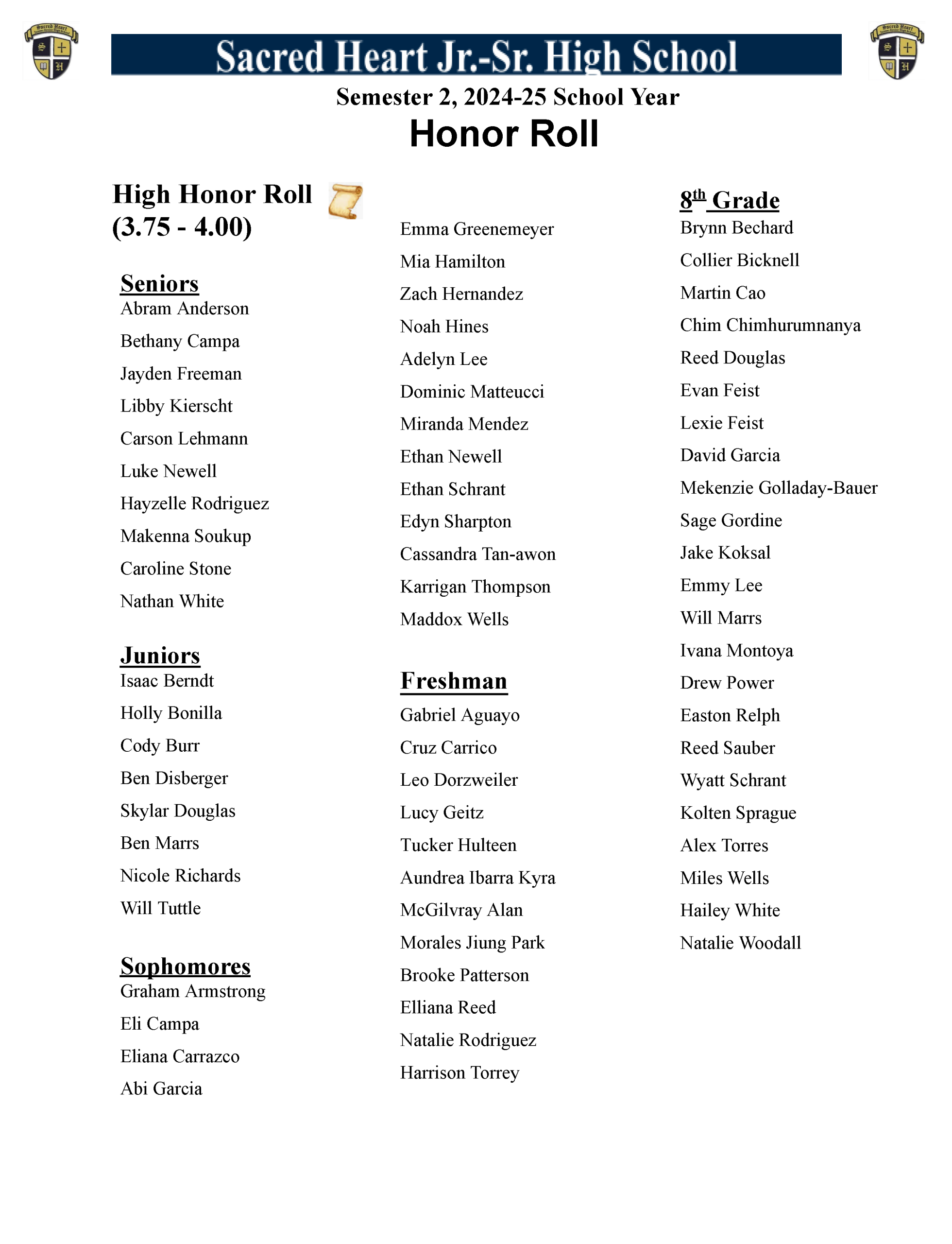 Salina Sacred Heart Jr/Sr High School has announced its honor roll recipients for the Spring 2025 semester.