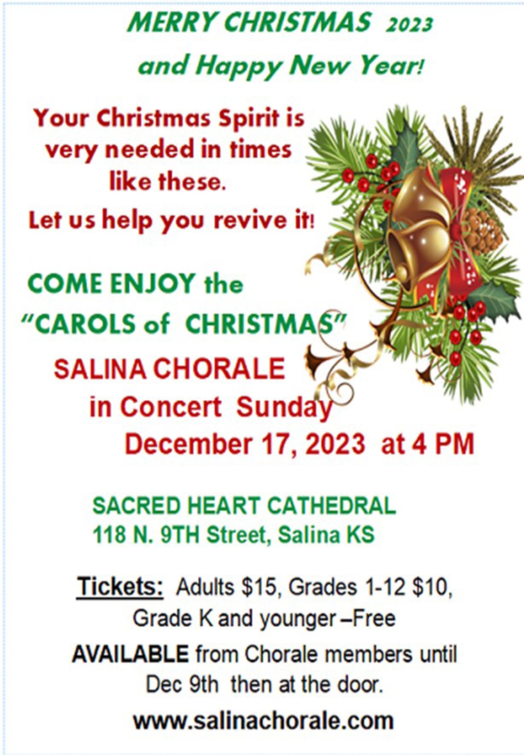 Adult tickets are $15, Students in grades 1-12 are $10, and children kindergarten and younger will be admitted free. Tickets are available for purchase from Salina Chorale members through Saturday, Dec. 9, and thereafter at the door just prior to our concert.