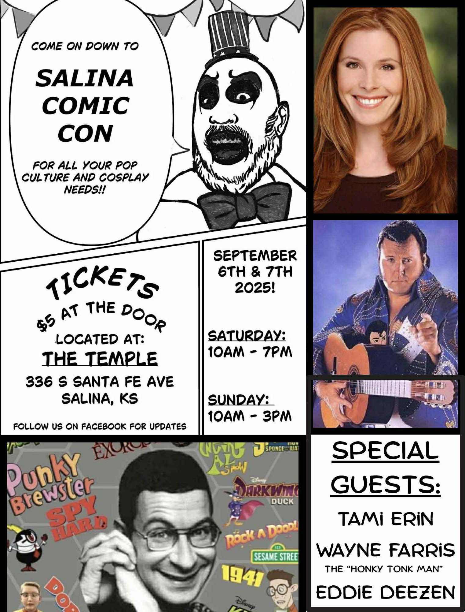 The Salina Comic Con will be Saturday September 6th 10am -7pm and Sunday September 7th 10am-3pm at the Temple. Tickets are $5 at the door.