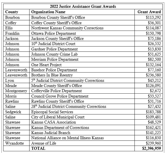 “These grant funds will provide our law enforcement and criminal justice agencies with the resources they need to keep Kansans safe,” Governor Kelly said. “I appreciate our partners at the U.S. Department of Justice for their support. My administration will continue leveraging every resource and seeking opportunities to make needed reforms in our criminal justice system and improve public safety for every person in our state.”