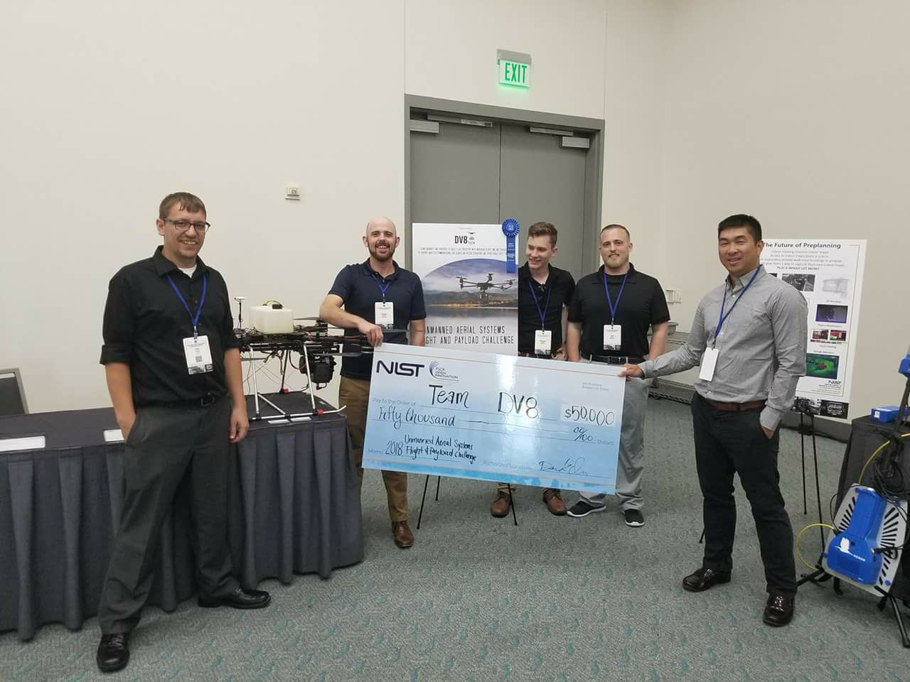 Hosted by NIST Public Safety Communications Research Program, the competition sought unique and innovative design concepts that displayed increased flight time and versality in supporting communication operations for search and rescue and public safety missions. DV8 Tech developed and then executed a hybrid gas/electric drone that was successful in demonstrating positioning and accuracy with the ability to carry 10, 15, and 20-pound payloads.