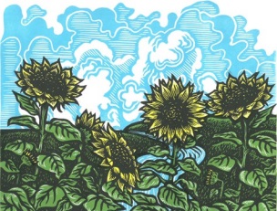 “Sun-Kissed” is a multi-block linocut print created by carving each color (yellow, blue, green, and black) on its own block and then printing the layers on top of each other. The festival print was inspired by the scenery of Central Kansas and how the natural elements connect to the Smoky Hill River Festival. Sunflowers radiate joy, positive energy, and good vibes – just like the River Festival. Gebhart states, “I absolutely loved going to Artyopolis as a kid. My parents would pretty much set me loose in that area of the festival and let me go wild.”