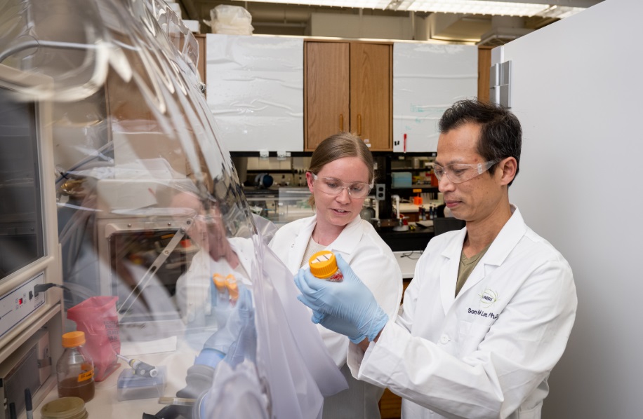 Photo: : Tanner Richie, left, pictured above with faculty mentor Sonny Lee, is conducting research about gut microbes and their relationship to better colon cancer care through personalized medicine.