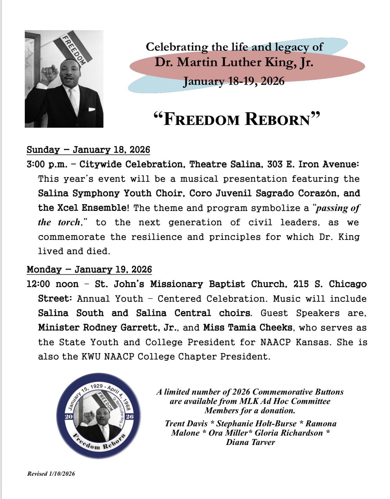 Salina will again celebrate the life and legacy of Dr. Martin Luther King Jr.  Events are planned for this Sunday, and Monday.