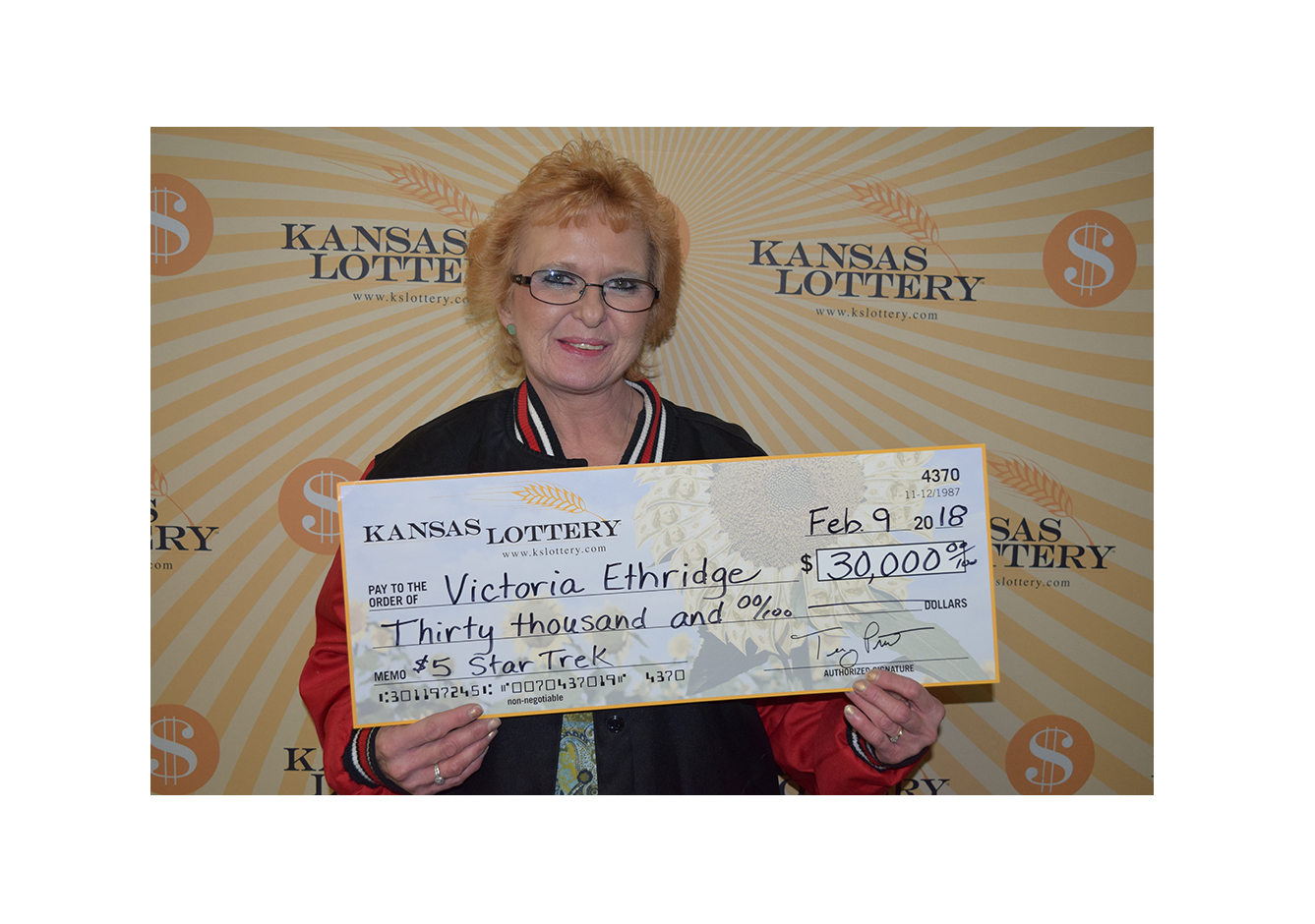 “I was alone in the house when I scratched it, and what a shock!” said Ethridge. The happy winner found her good fortune two days after Christmas, but she waited until now to make the trip to Topeka to claim the ticket.
