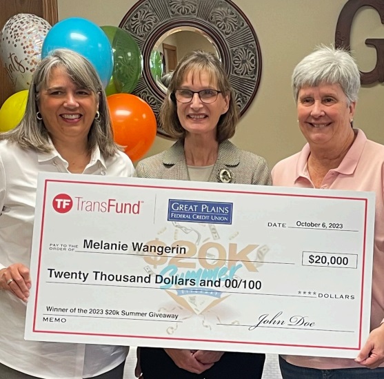 According to Great Plains Federal Credit Union, Melanie Wangerin was the grand prize winner of $20,000 in the TransFund $20K Summer Giveaway sweepstakes. Wangerin, a longtime credit union member and Salina resident, used her Great Plains Federal Credit Union Debit Mastercard for purchases during the sweepstakes period. Her transaction was randomly drawn by Mastercard from millions of purchase transactions performed by cardholders of participating TransFund financial institutions.