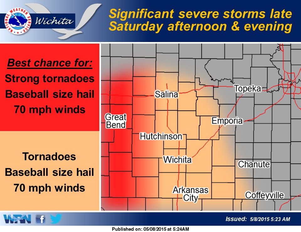 According to the National Weather Service, significant severe storms are expected late Saturday afternoon and evening across central and south central Kansas.