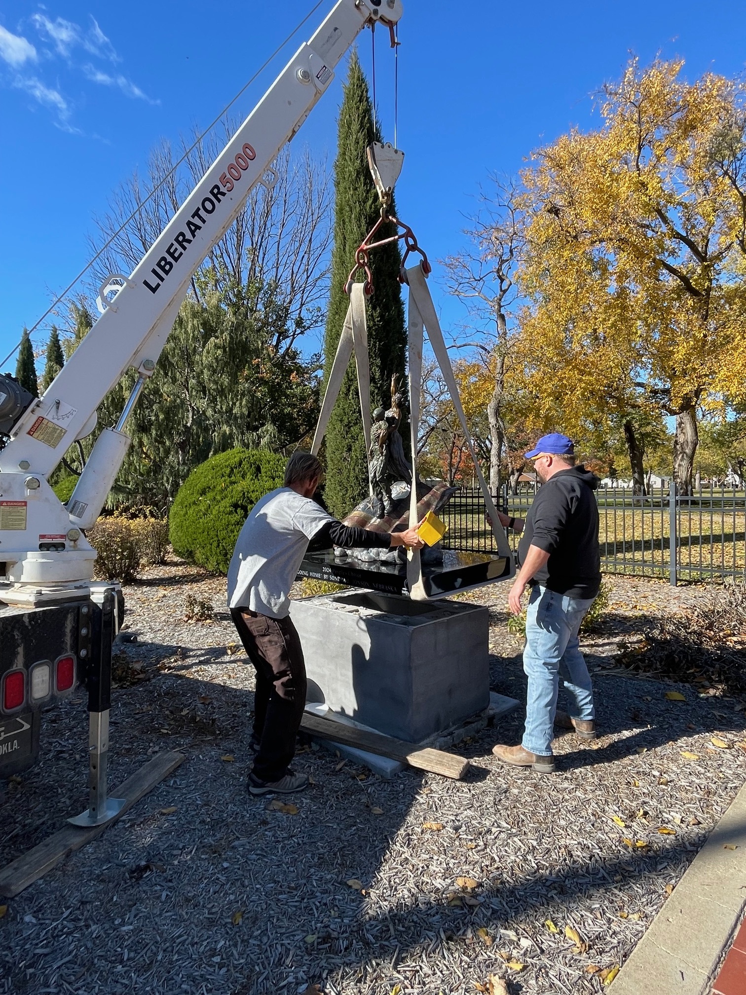 According to Salina Arts and Humanities, “Going Home” was successfully placed within the Saline County War Memorial in Sunset Park just ahead of Veteran’s Day. Memorial Art Company took great care of the final details, craning in the sculpture, which was secured to the polished black granite capstone ahead of the final delivery. The granite complements the art and environment as it reflects the surroundings in the polished surface.