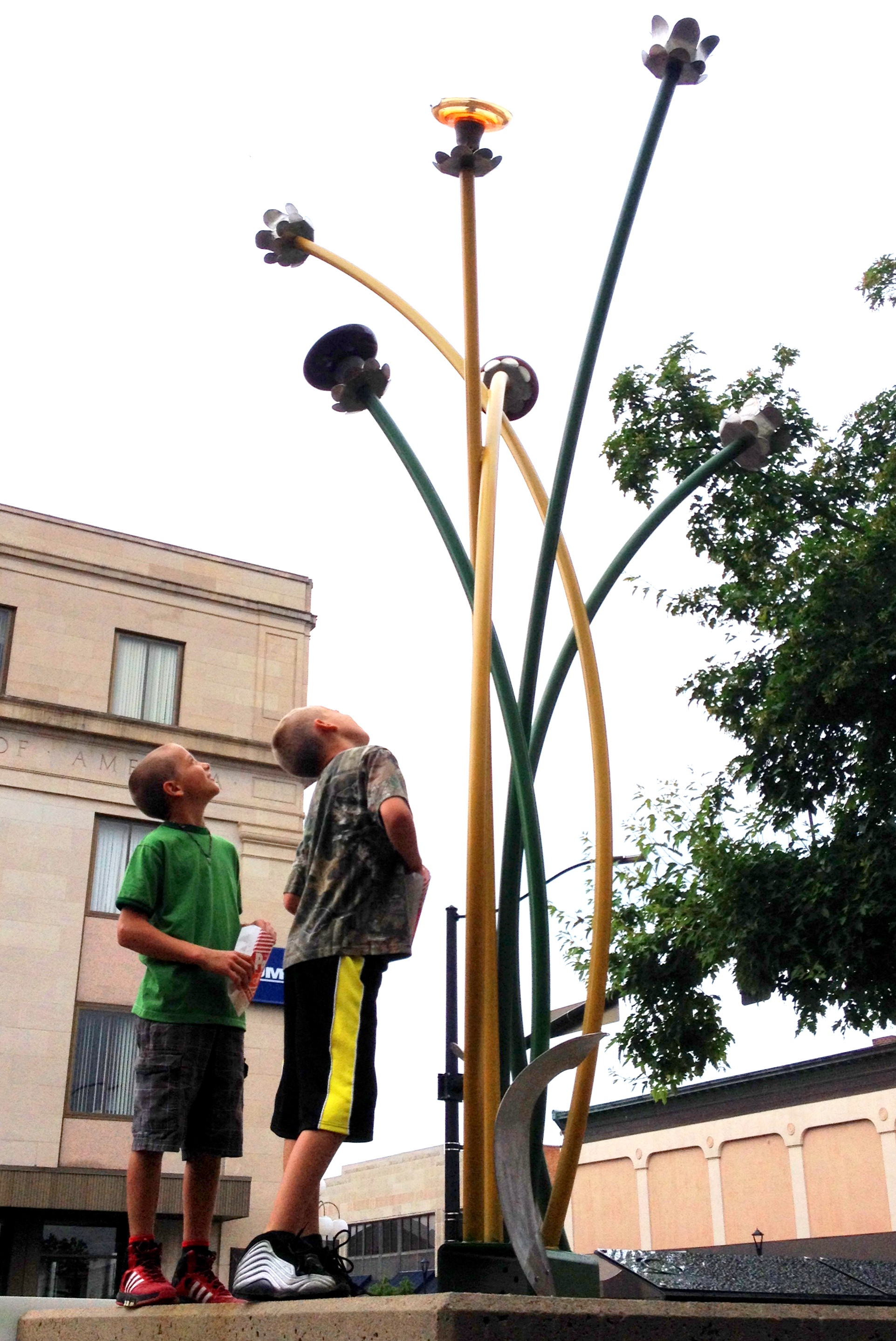 Saxen and Sawyer Walker of Salina both climbed up to take a closer look at “Flora Grande II” a work of steel and copper sprouting out near the corner of Sante Fe and Iron Avenue, “They look like flowers,” Saxen said.