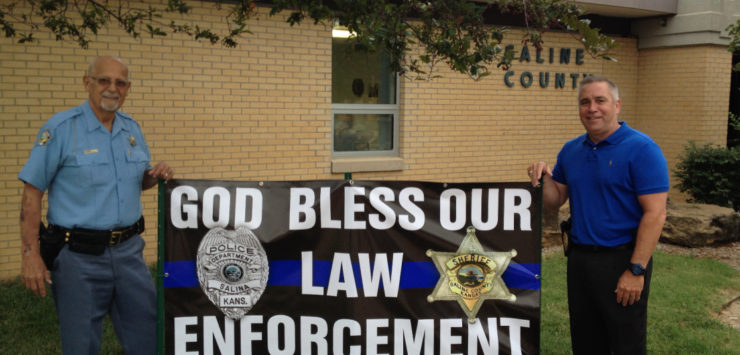 A professionally made vinyl banner reading “God Bless Our Law Enforcement” was erected in a grassy area near the entrance to the Saline County Sheriff’s Office and the Salina Police Department. The banner also has both a Salina Police and Saline County Sheriff badge on it.