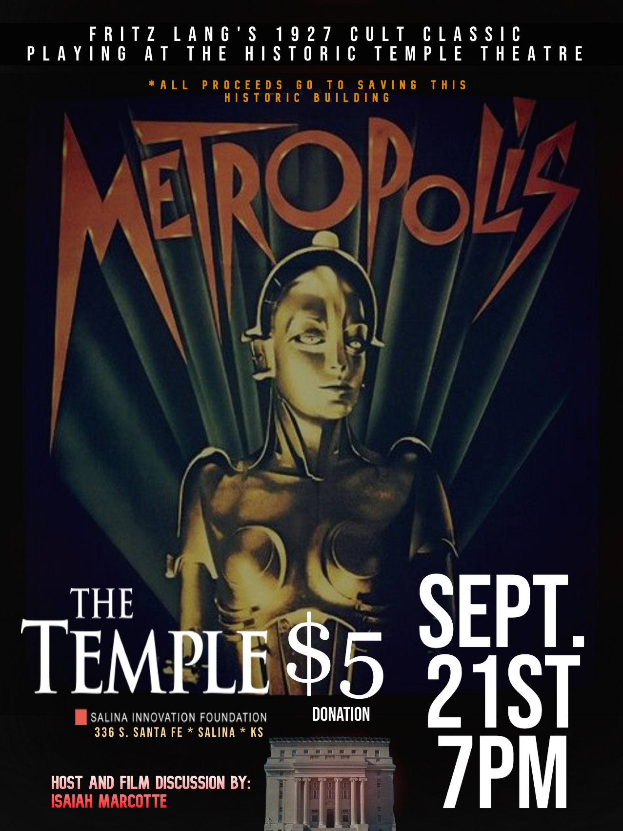 A classic silent film is set to screen in Salina at a classic venue. Fritz Lang’s 1927 epic “Metropolis” will be shown this coming Saturday at the theatre inside the Temple in downtown Salina.