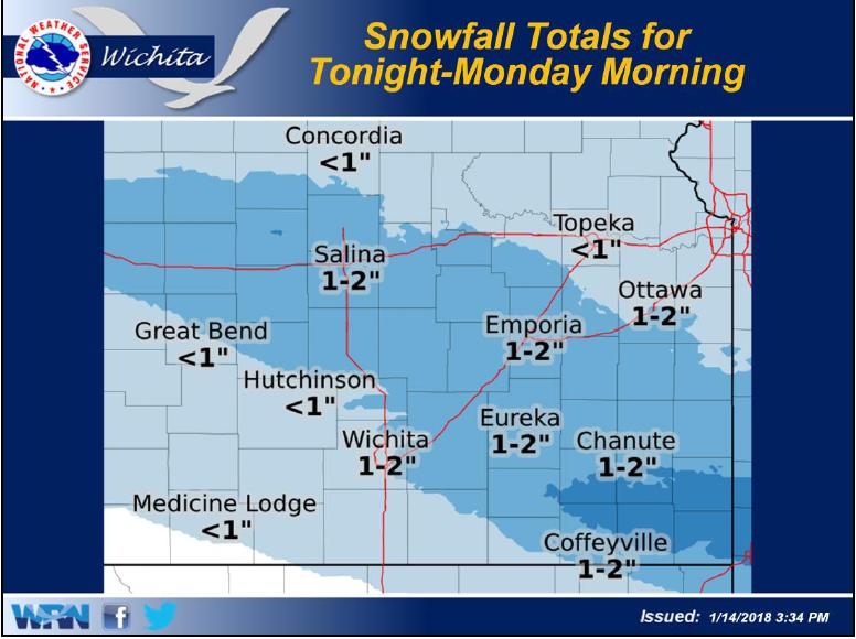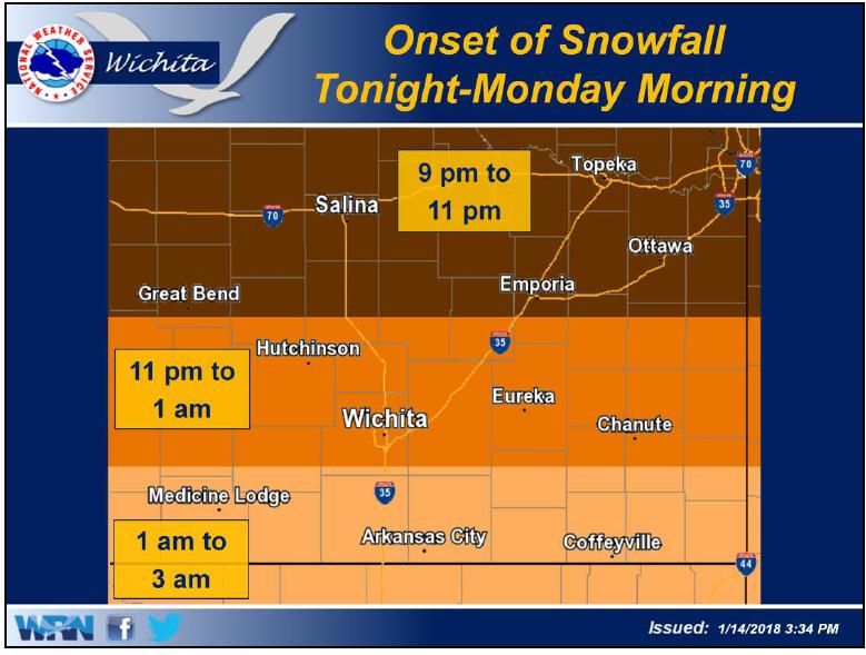According to the National Weather Service in Wichita, light snow will develop behind a cold front and make its way southward across the area late Sunday night and into Monday morning. Snow will diminish from north to south during late morning or early afternoon.