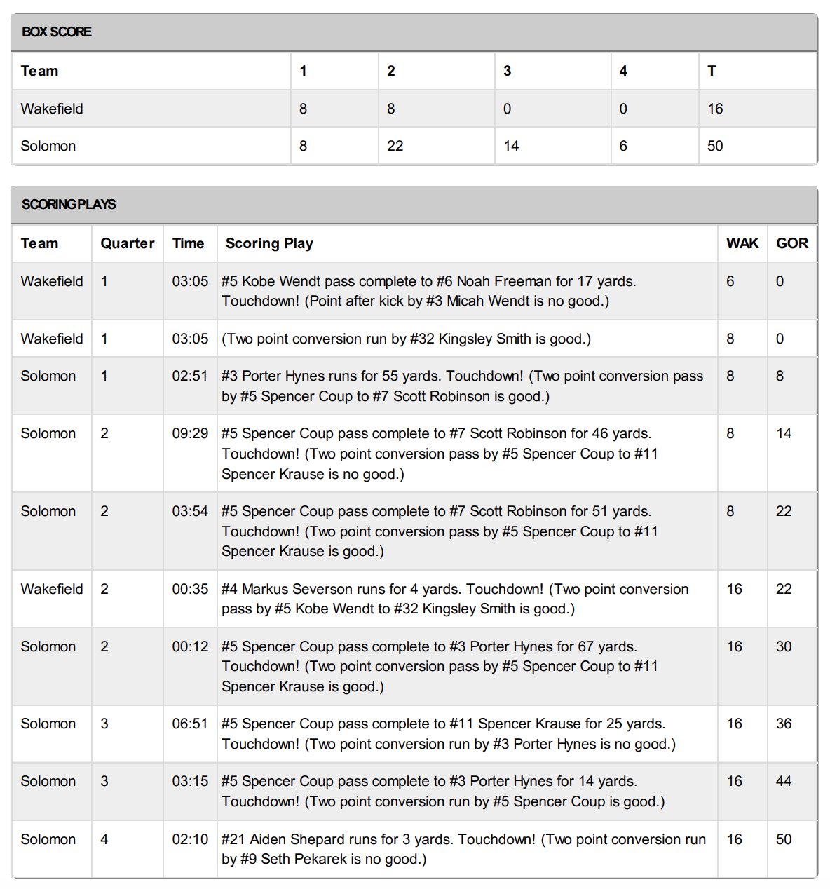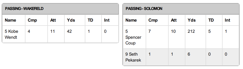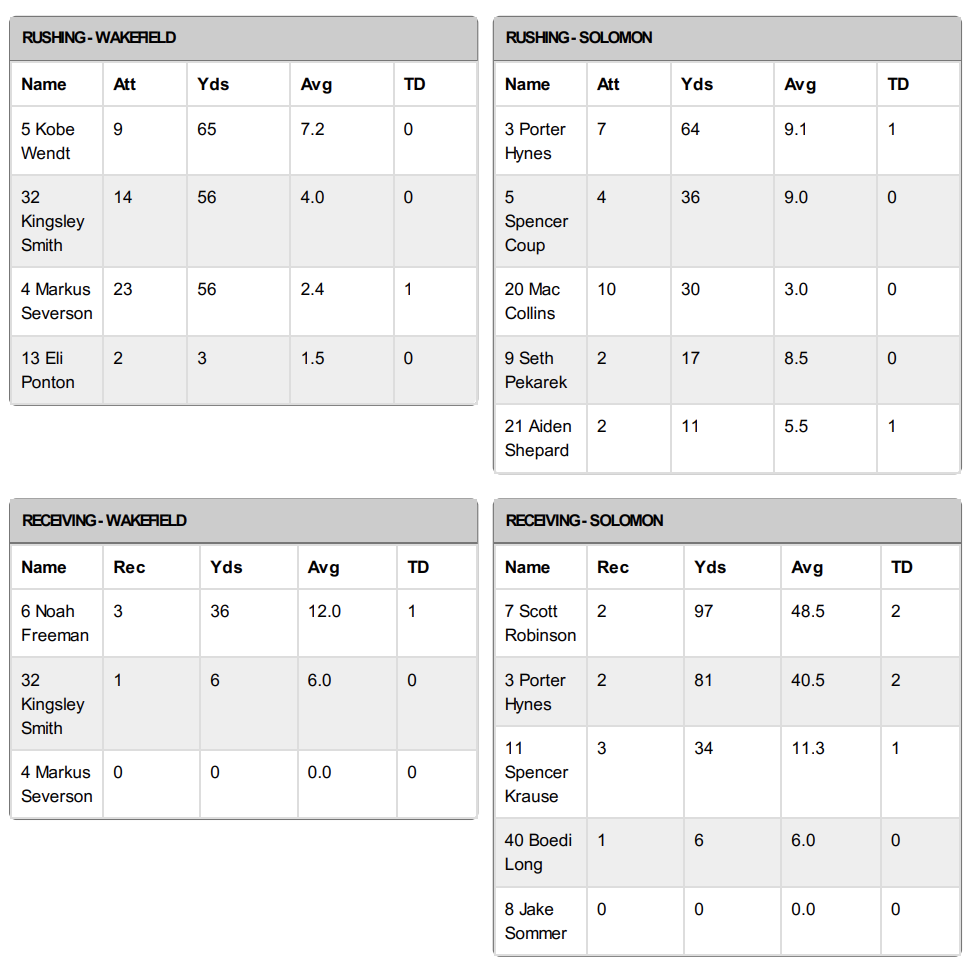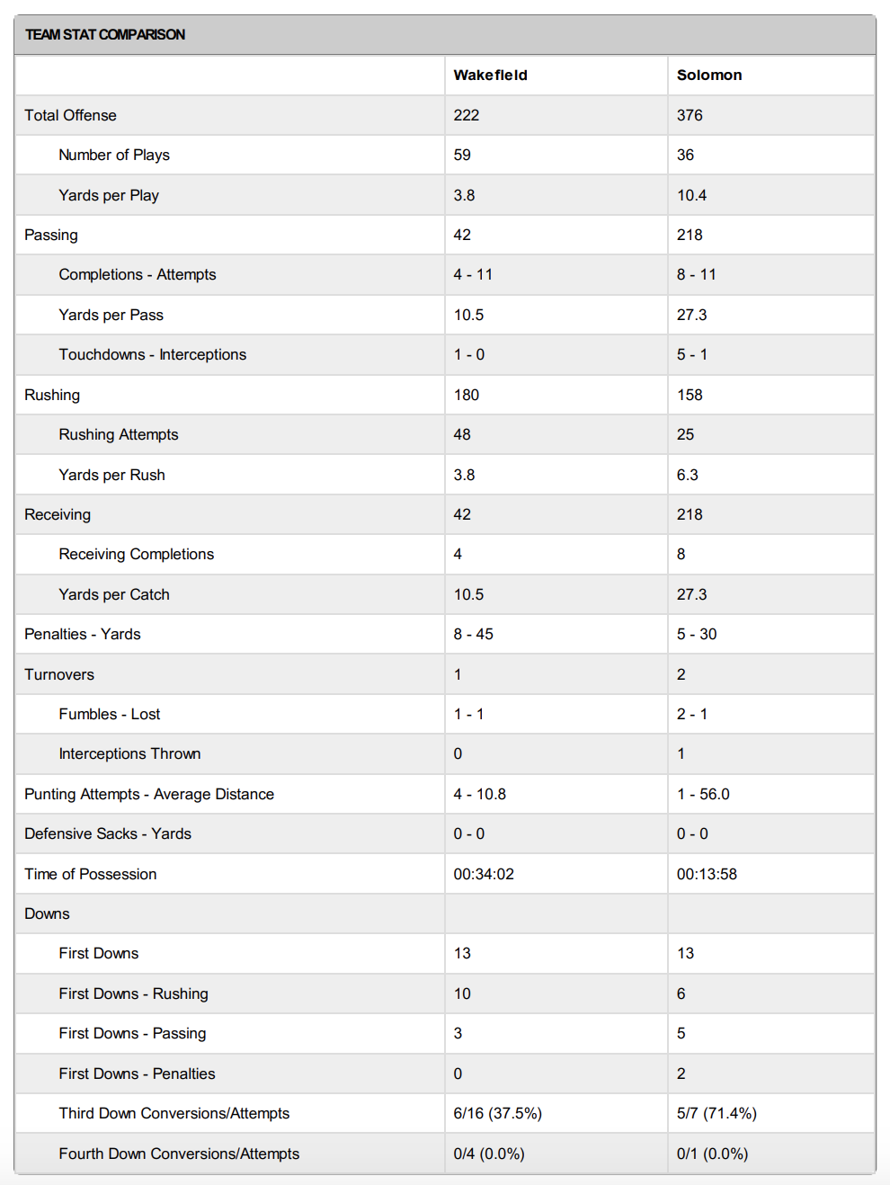 Solomon moved to 2-0 on the season with a 50-16 win over Wakefield on Friday night. A full stats recap of the victory is below:
