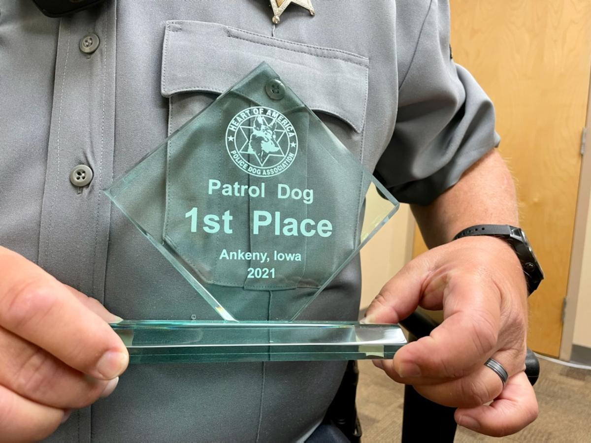According to Sheriff Roger Soldan, Deputy Craig Norris and Maggie recently returned from Ankeny, Iowa with a first place trophy after Maggie outscored nine other teams – competing in four ‘Patrol Dog’ disciplines.