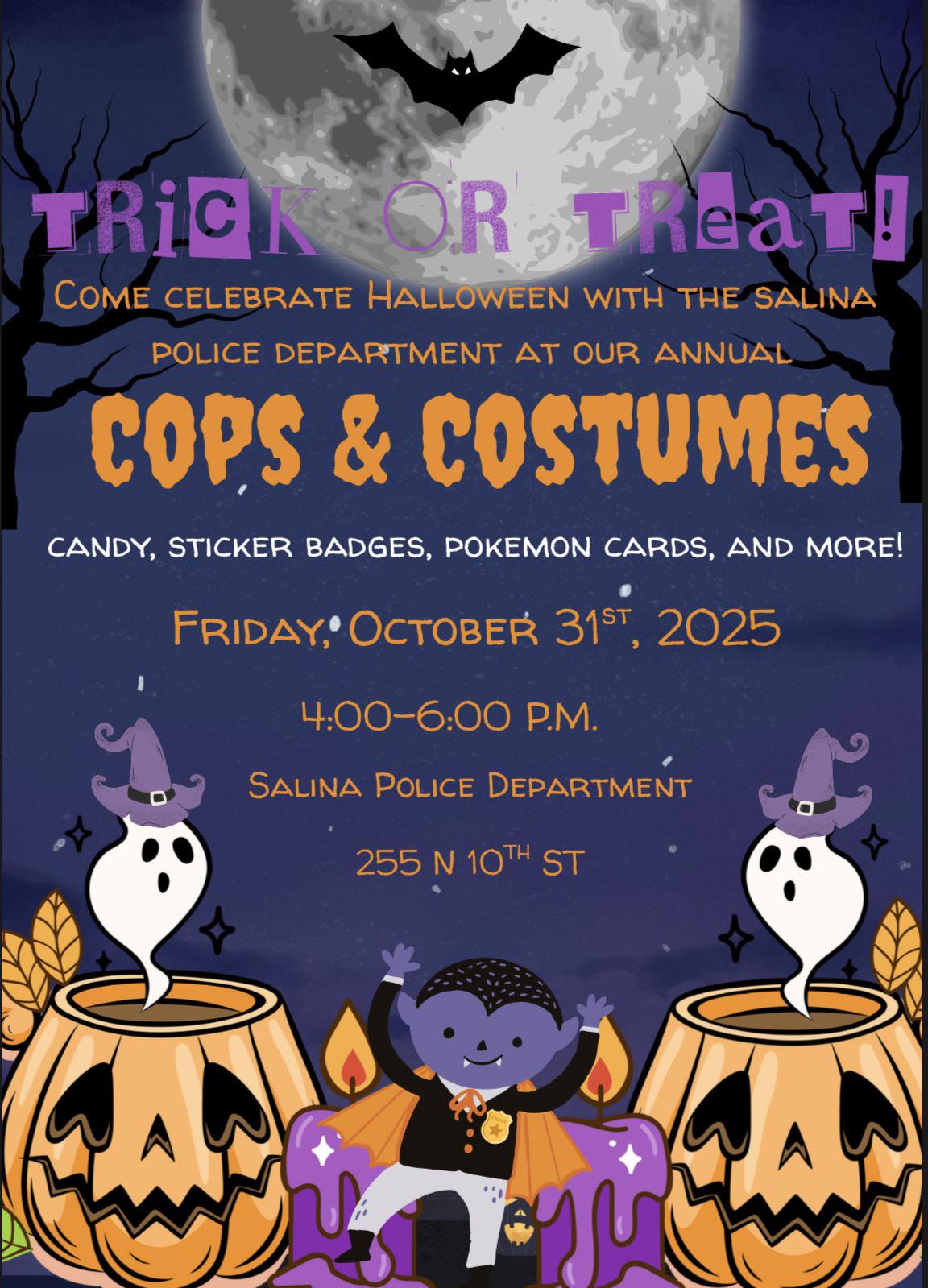 Among the planned events is “Cops and Costumes”. This event has become a must stop for a kid friendly Halloween experience in Salina. Salina It will take October 31st from 4pm to 6pm at the Salina Police Department located at 255 North 10th Street. Salina Police officers will be on hand to greet children and adults and hand out tasty treats and stickers. Children will have a chance to take some great photos with officers and enjoy the vehicles on display.