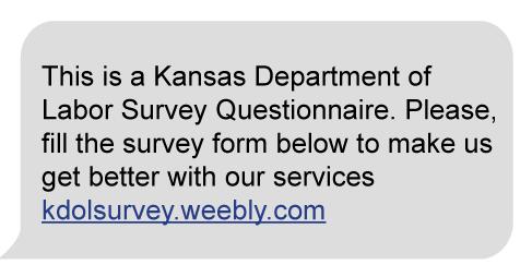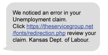 The Kansas Department of Labor is urging everyone to be aware that a fraudulent SMS phishing attempt is being distributed. This is not from the Kansas Department of Labor and no links should be clicked. If you receive a text like this, please delete it immediately.