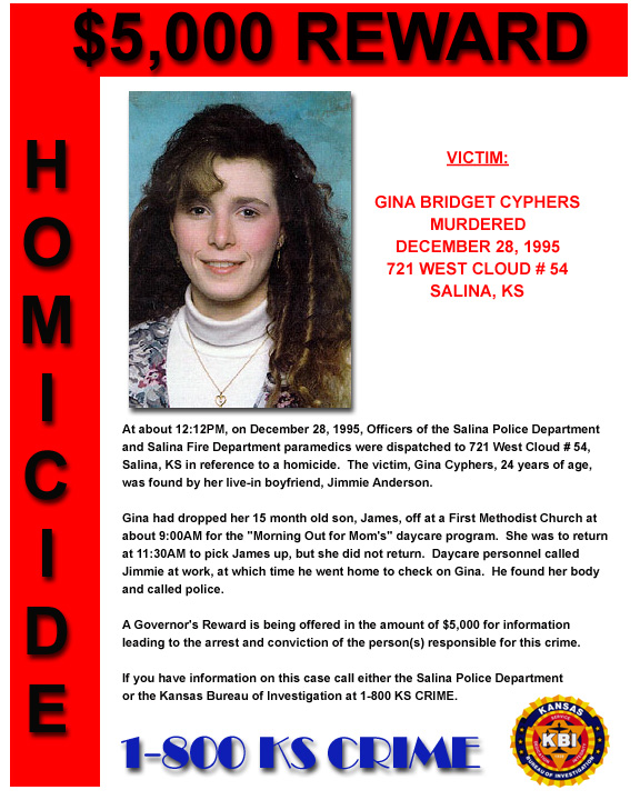 Gina Bridget Cyphers was murdered December 28th, 1995. At about 12:12 pm that day first responders were dispatched to 721 West Cloud #54 in reference to a homicide. The victim, 24-year-old Gina Cyphers, was found by her live-in boyfriend, Jimmie Anderson.