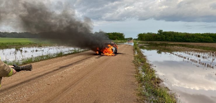 A vehicle reported stolen in Salina was discovered abandoned, on fire, in rural Saline County.
