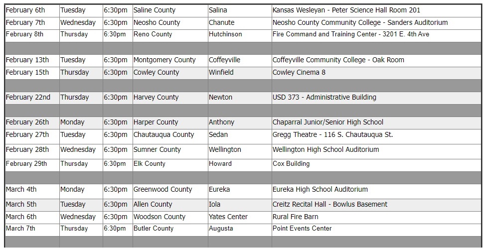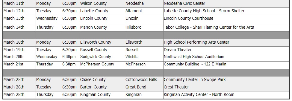 The event in Salina is scheduled for Tuesday, February 6th, hosted by Saline County Emergency Management. It will be held at Kansas Wesleyan University’s Peter Science Hall Room 201, with doors opening at 6 p.m. and the program starting at 6:30 in the evening.