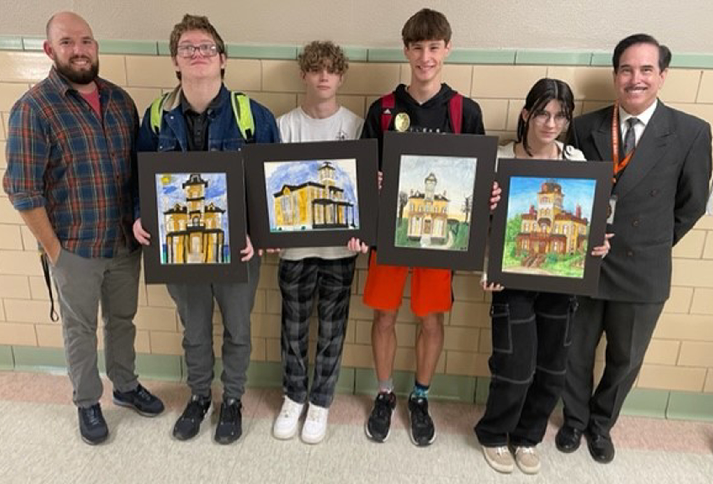 The previous day, Tatner visited Abilene High School to thank the Art Class students who chose to draw the Lebold Mansion. The ink pen and water color drawings were superb. Thanks to middle school Art Teacher Mr. Callis and high school Art Teacher Mr. Meyers.