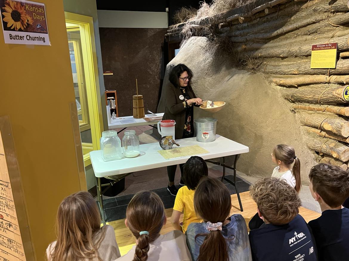 Hundreds of grade school children are participating in special activities at the Smoky Hill Museum. The children, all third-graders, have been learning what life was like for pioneers back in 1861, when Kansas became the 34th state. Activities include shelling and grinding corn, packing a covered wagon, churning butter, and playing some of the same games pioneer children played.