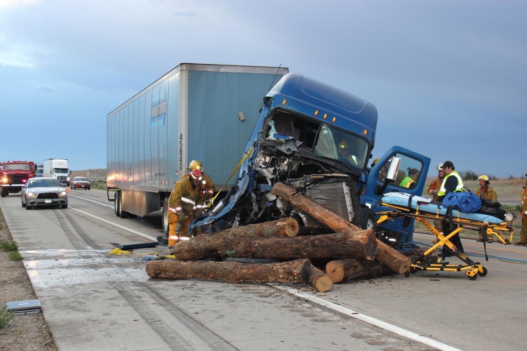 According to the Kansas Highway Patrol, the truck hauling logs was rear ended by the otter semi. The driver of the semi that collided with the truck hauling logs was trapped, and had to be extracted by firefighters from the cab of the semi