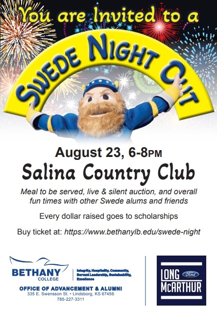 Bethany College is pleased to announce the upcoming event, “Swede Night Out,” scheduled for August 23rd from 6-8pm at the Salina Country Club.