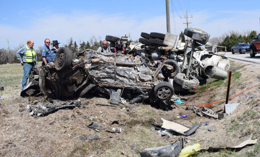 Investigation at the scene indicated that a 2005 International cement truck driven by 39-year-old Billy Love of Great Bend was headed north on Washington Avenue. A 2007 Saturn Ion driven by 18-year-old Shealee A. Stover of rural Olmitz was headed west on North East 30 Road approaching a stop sign. The car failed to stop at the stop sign and was struck by the cement truck.