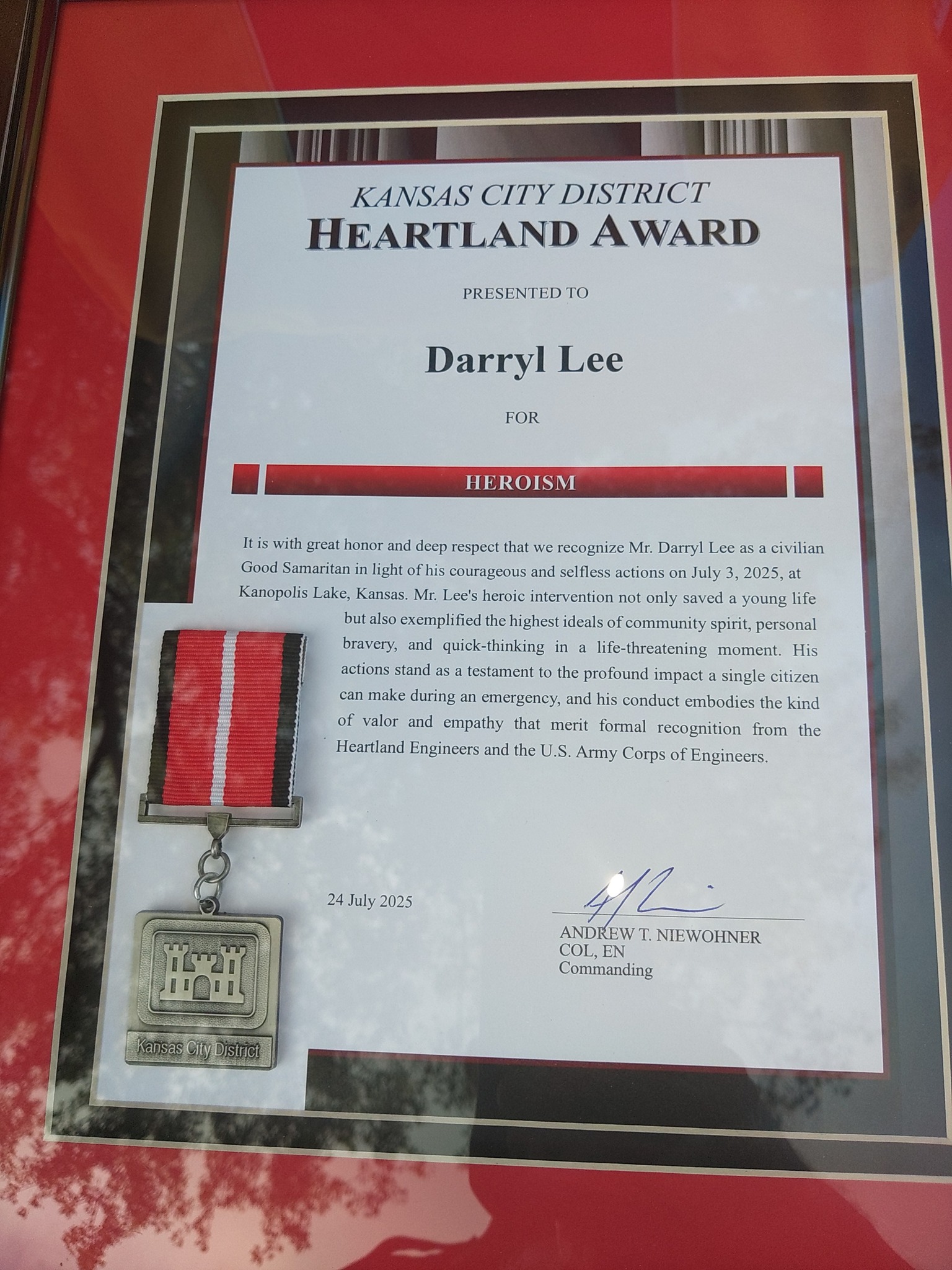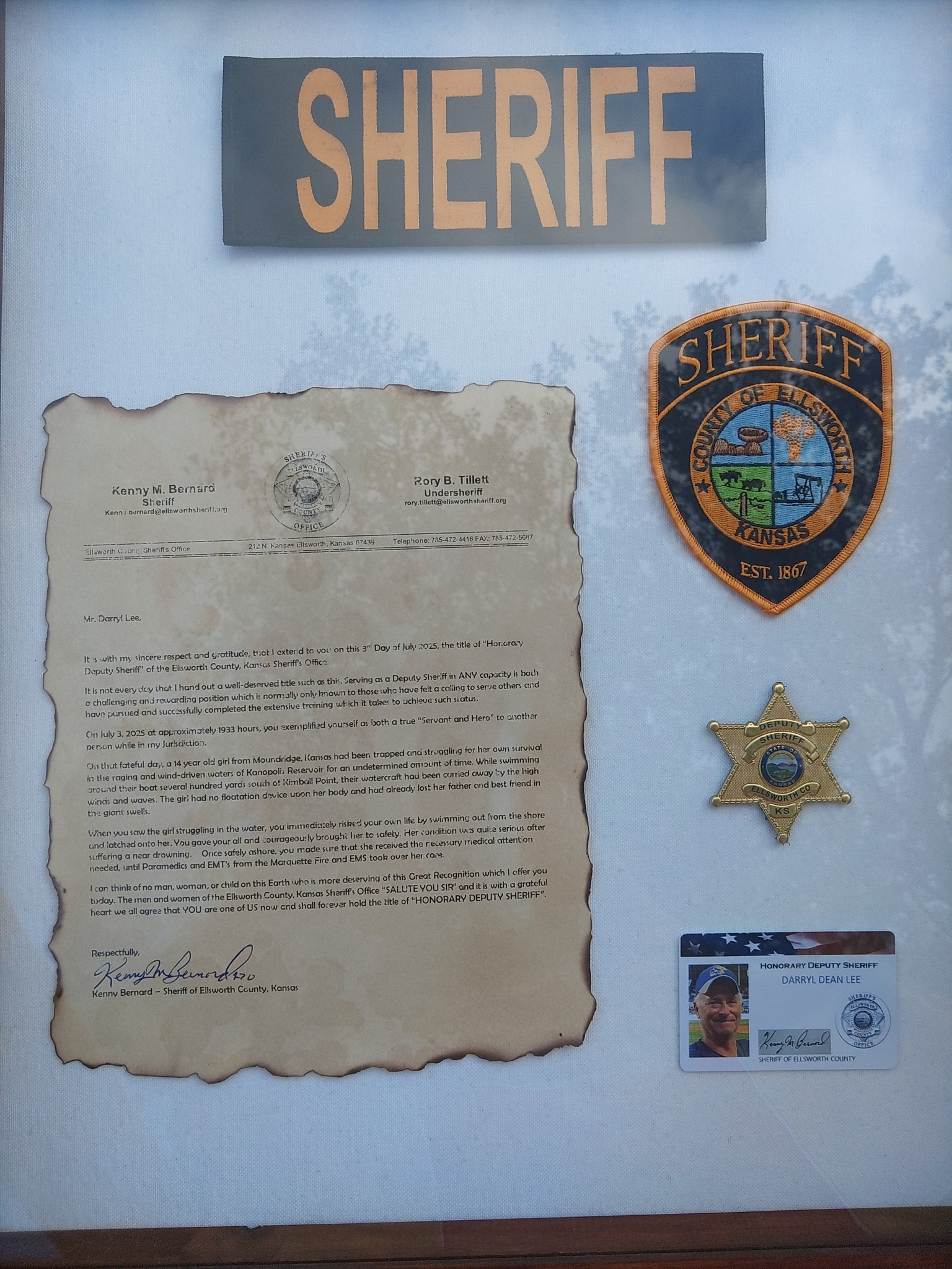 Lee received an Honorary Deputy Commission from Ellsworth County Sheriff Kenny Bernard, complete with a shadowbox assembled by Ellsworth County Sheriff’s Office employees. The US Army Corps of Engineers also presented him with the “Heartland Award” for his actions of that day.