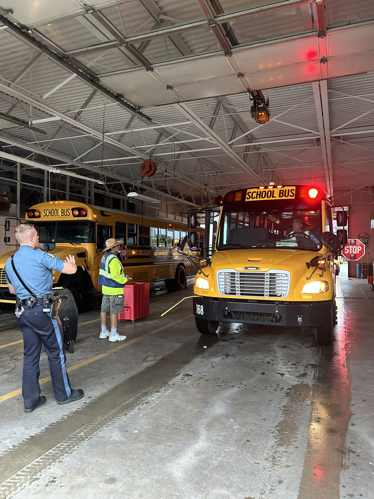 Troopers will check the buses until the beginning of the school session to make sure the vehicles will safely load, transport, and unload students. Troopers will check the lights, emergency exits, tires, windshield wipers, fire extinguishers, first aid kits and emergency spill kits.