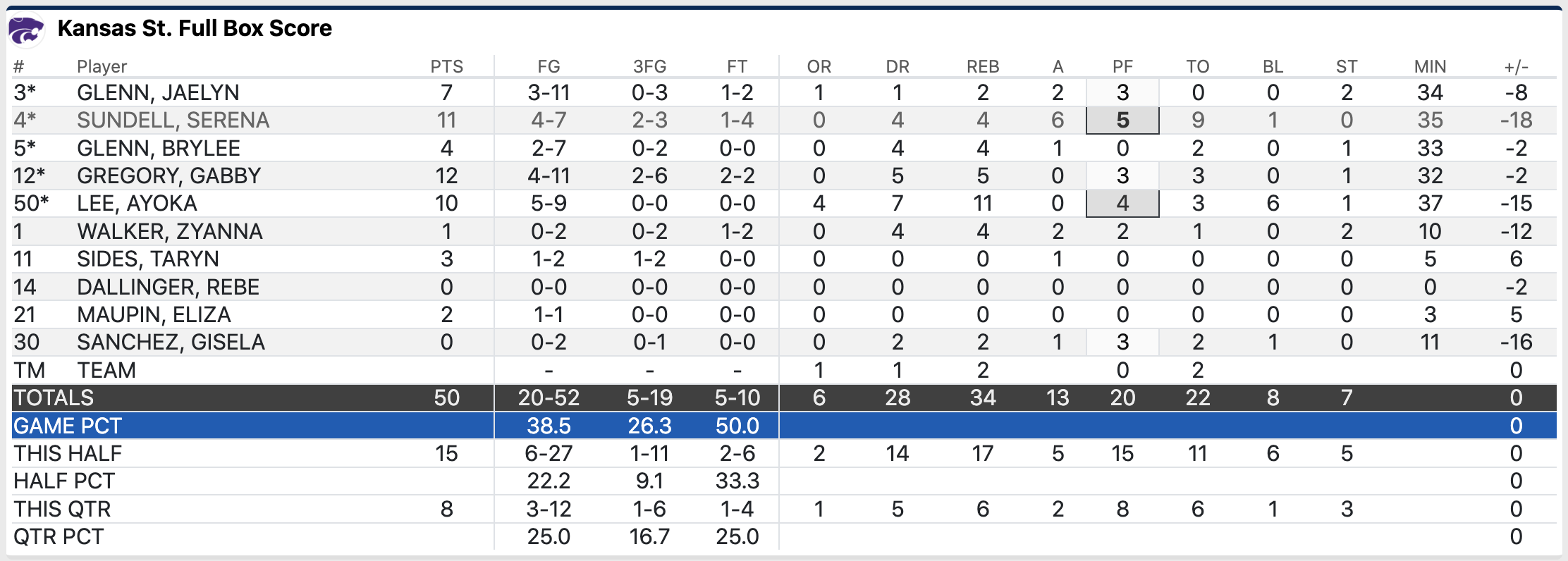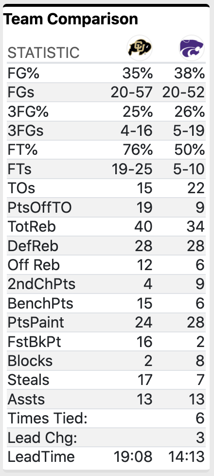 Kansas State would hold a 35-33 advantage at halftime, but following the intermission would be when Colorado took over. The Buffaloes out-paced K-State 30-15 after halftime, holding K-State to just 22% shooting after the break (6-27 overall).