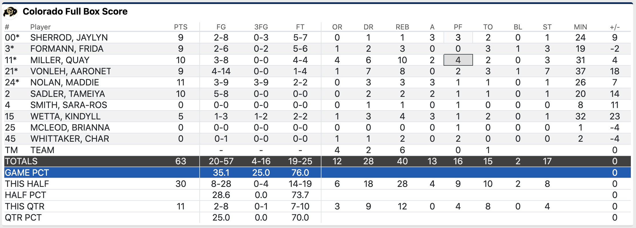 Vonleh would score nine points in the game, one of nine Buffaloes to register nine or more points. Maddie Nolan would lead Colorado with 11 points on 3-9 shooting from three point range. Quay Miller and Tameiya Sadler would each score 10 as well.