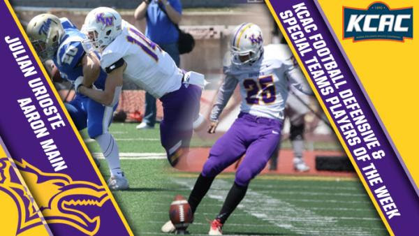 Kansas Wesleyan’s Julian Urioste (FR/Portales, N.M.) and Aaron Main (JR/Tulsa, Okla.) were named as the KCAC Defensive and Special Teams Players of the Week, respectively, for their efforts in KWU’s victory over the Tabor Bluejays on Saturday in Hillsboro.