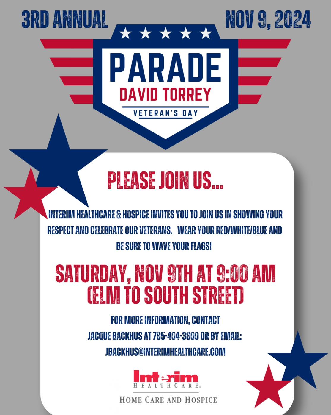 The parade to honor veterans is being presented by Interim Healthcare home healthcare services. It will be held this Saturday, November 9th. It will begin at 9am.
