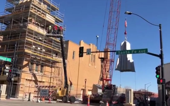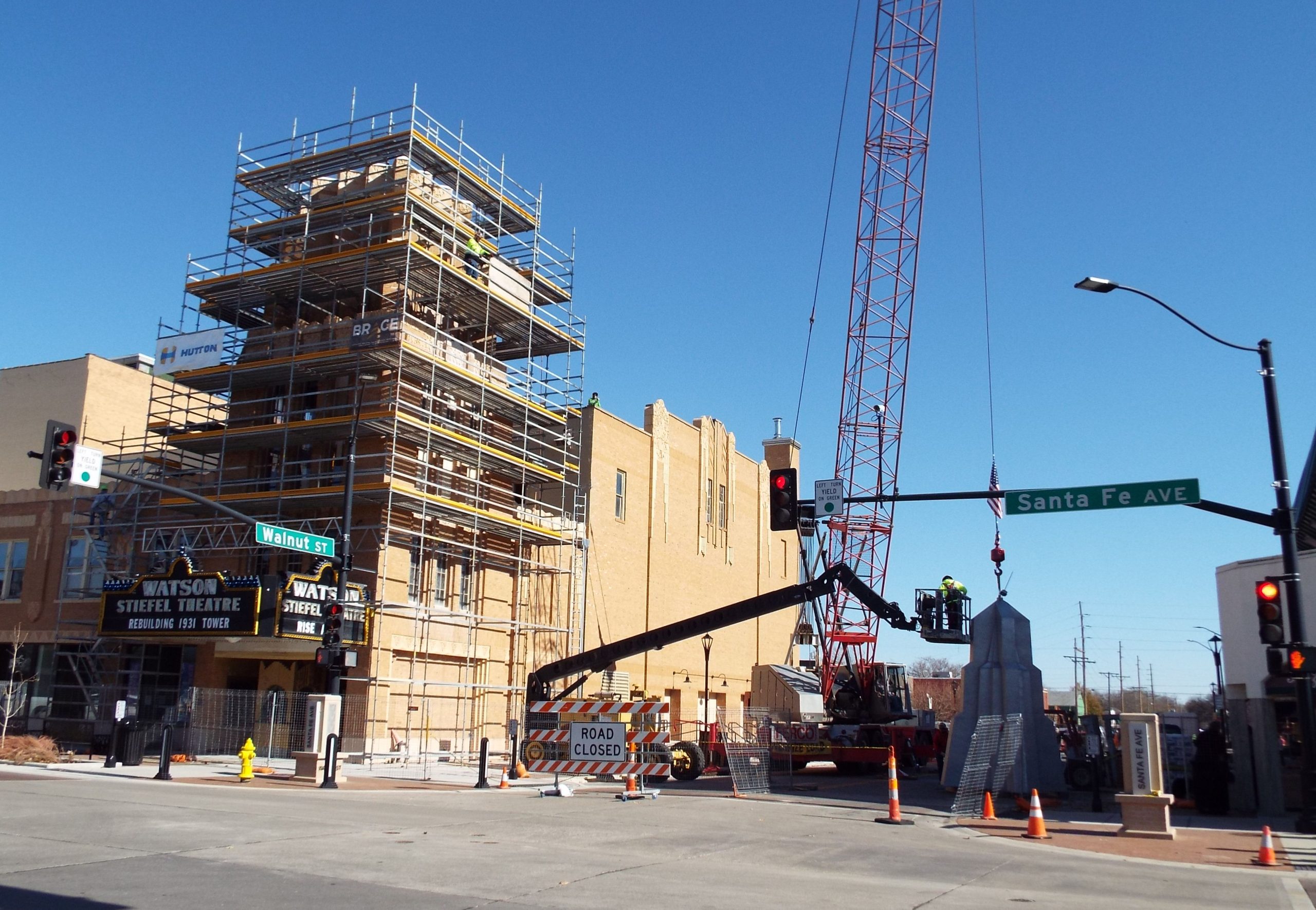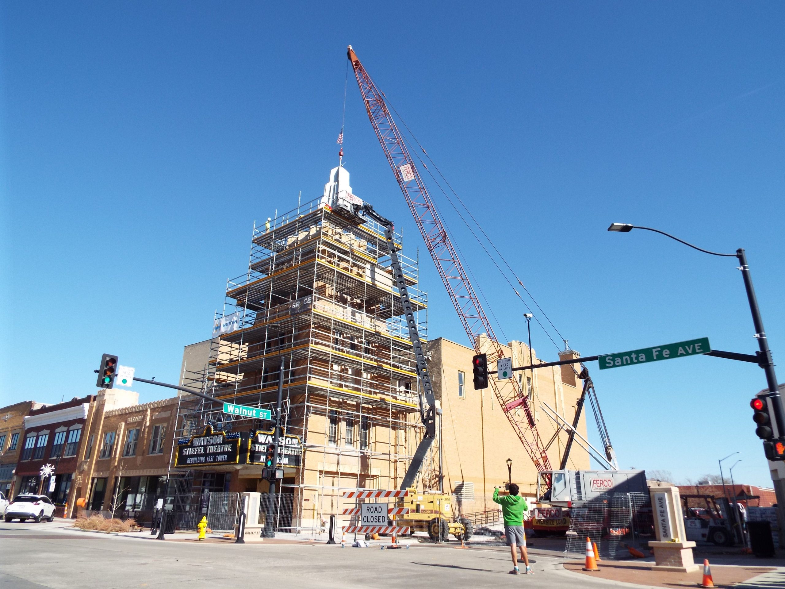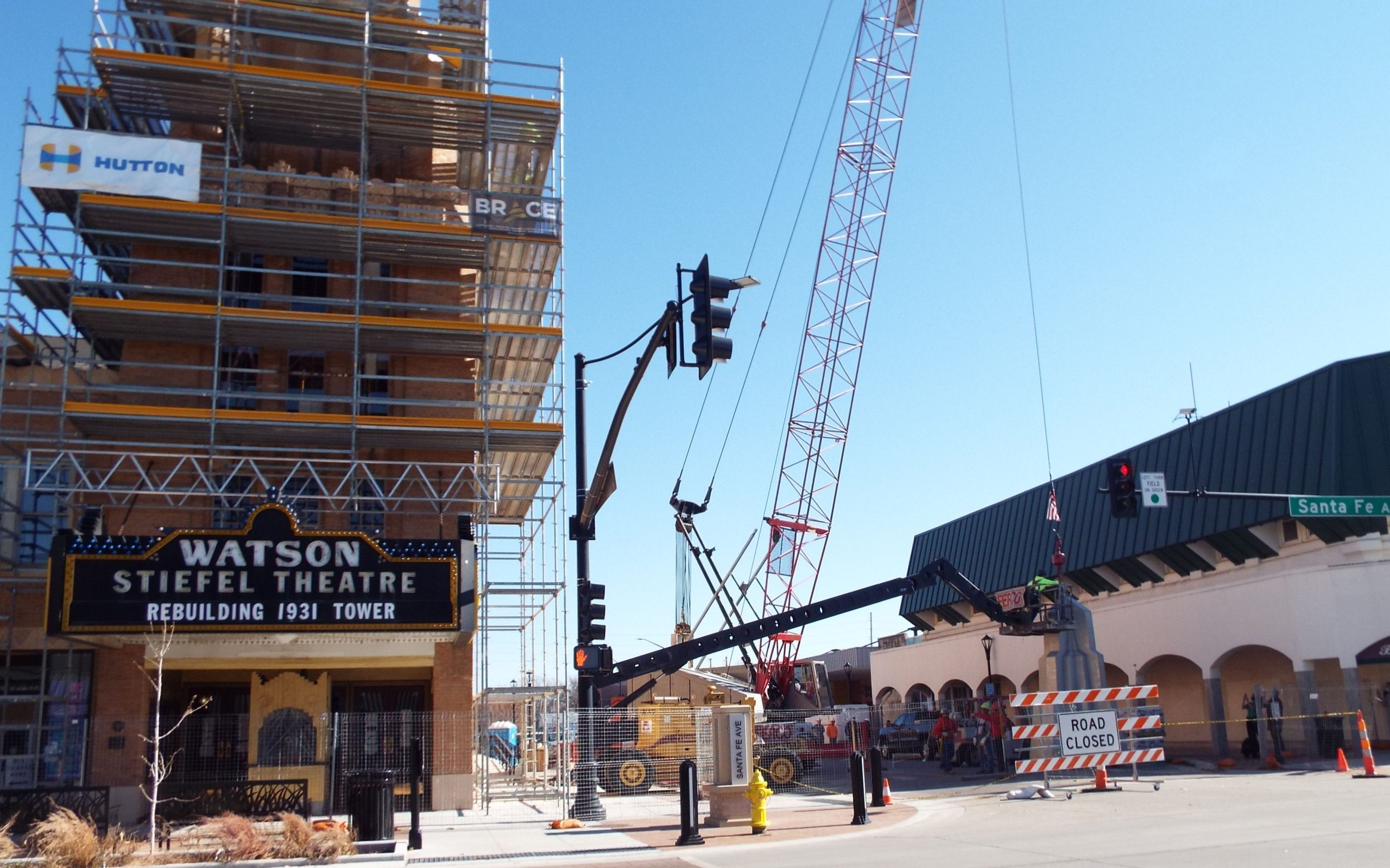 As a large, curious crowd gathered to watch, the new Stiefel Theatre spire for the newly built tower was hoisted high above the street and secured into place.