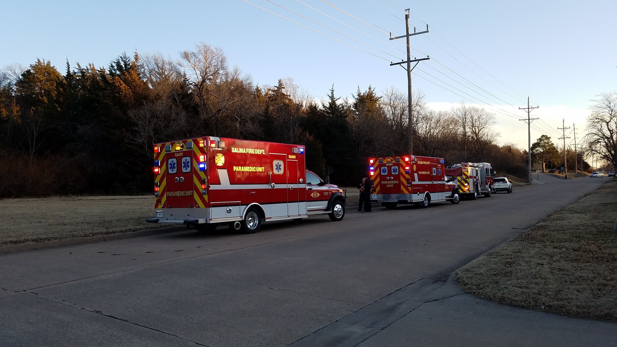 Salina Fire Department Battalion Chief David Turner told KSAL News at the scene the three teens were on the ice at the pond at Indian Rock Park. All three fell through the ice into the water. Though it was only about waist deep, they became trapped in the ice and mud and couldn’t get out.