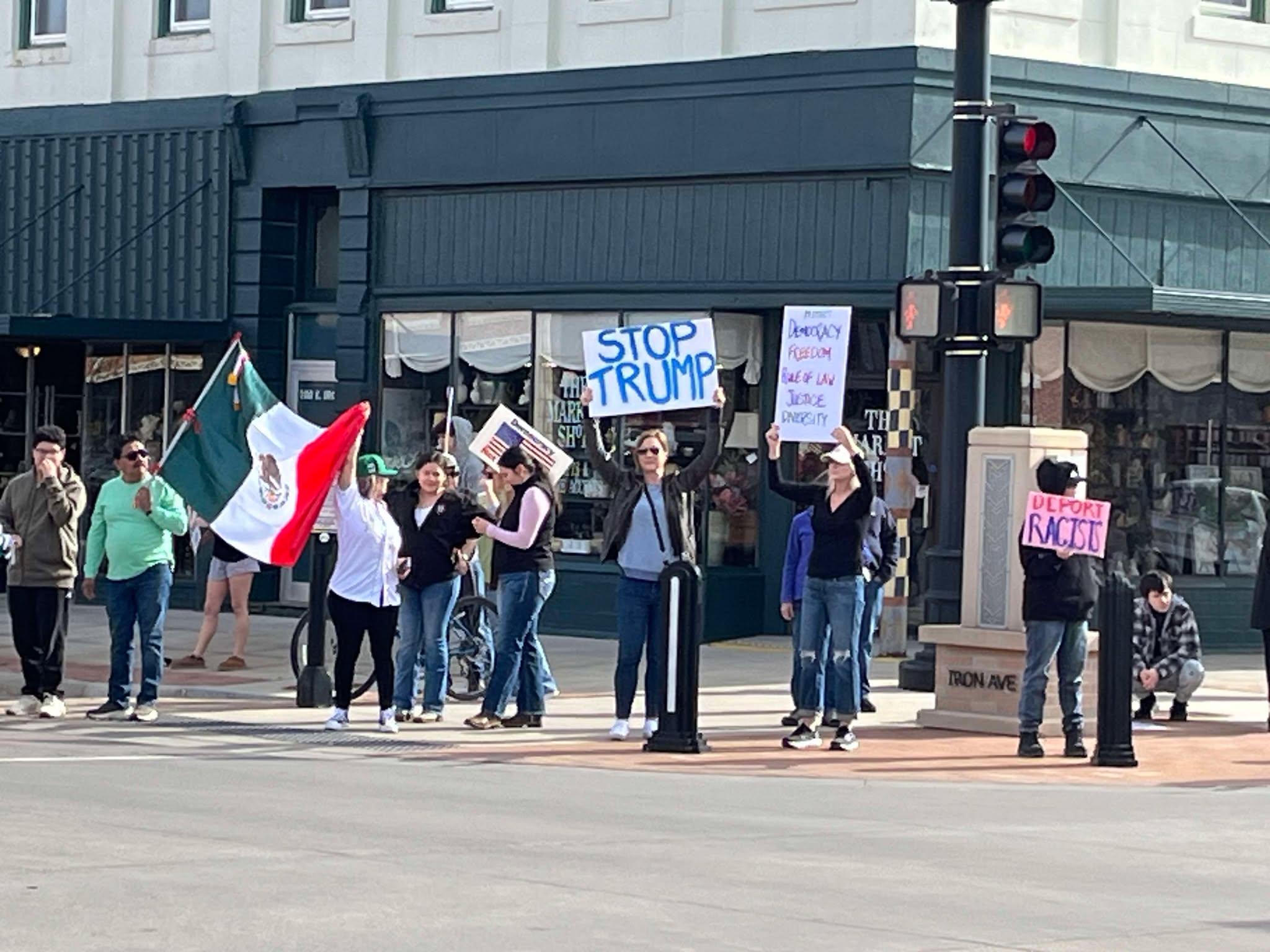The group stopped at the corner of Santa Fe and Iron, where they spread out on all four corners to demonstrate. They sporadically cheered when passing vehicles honked.