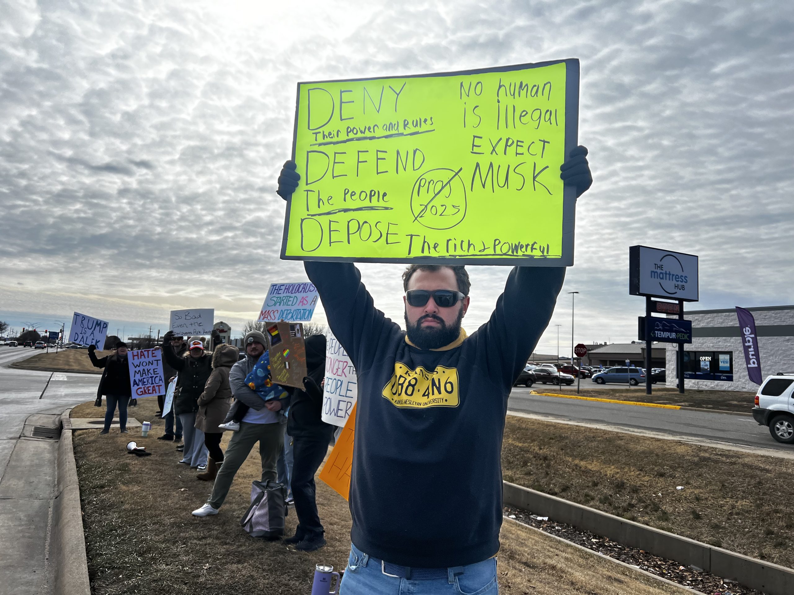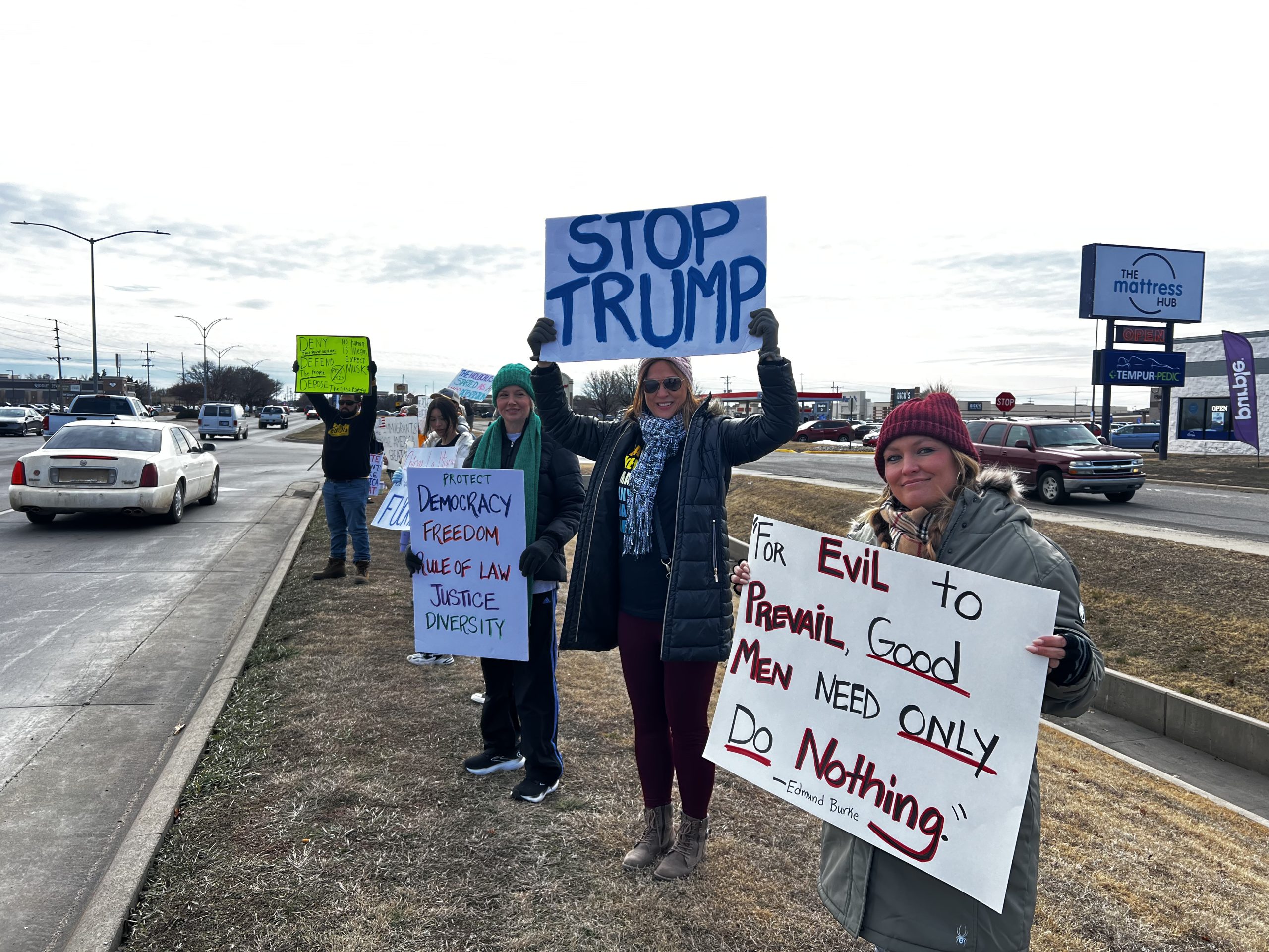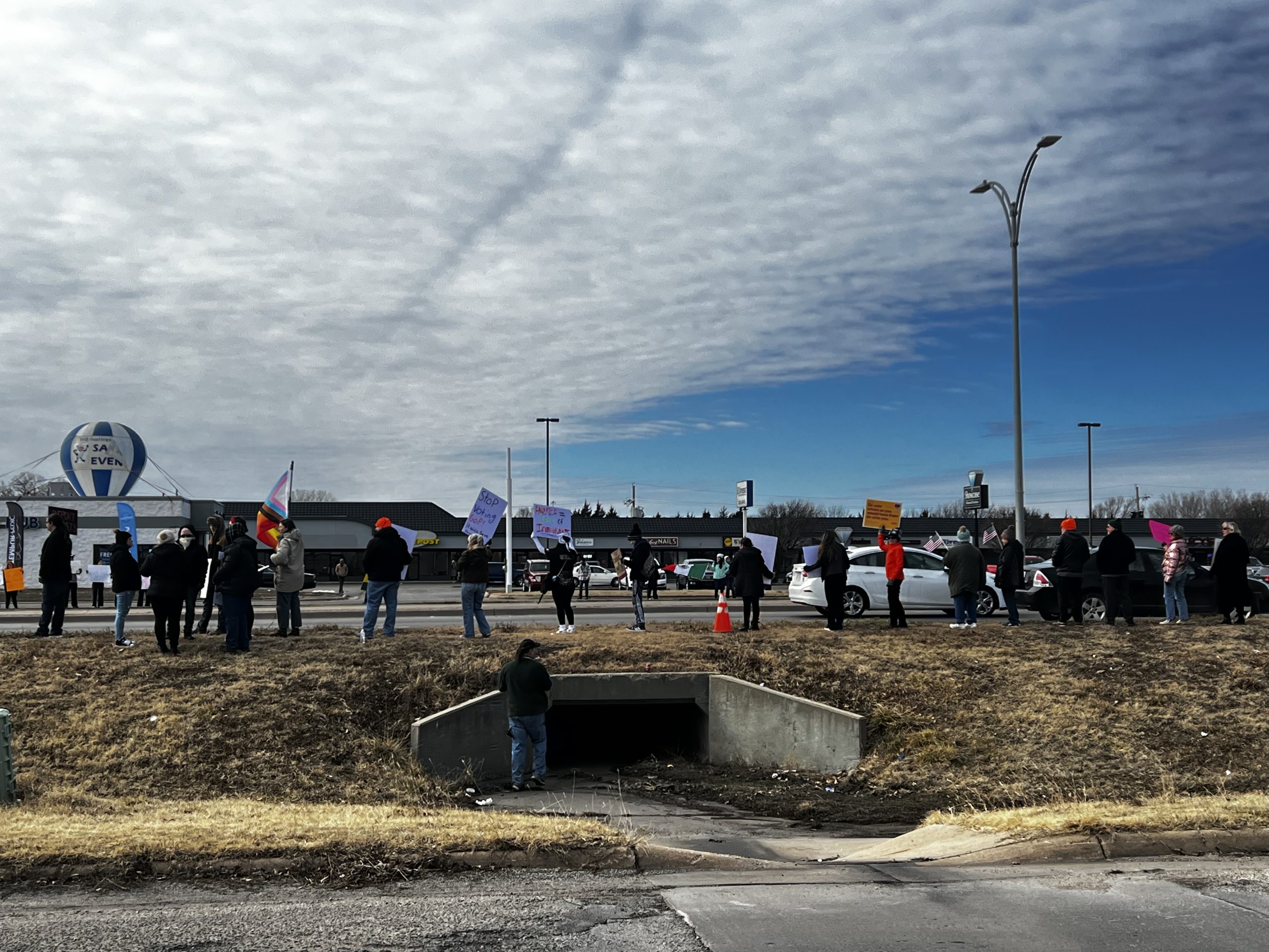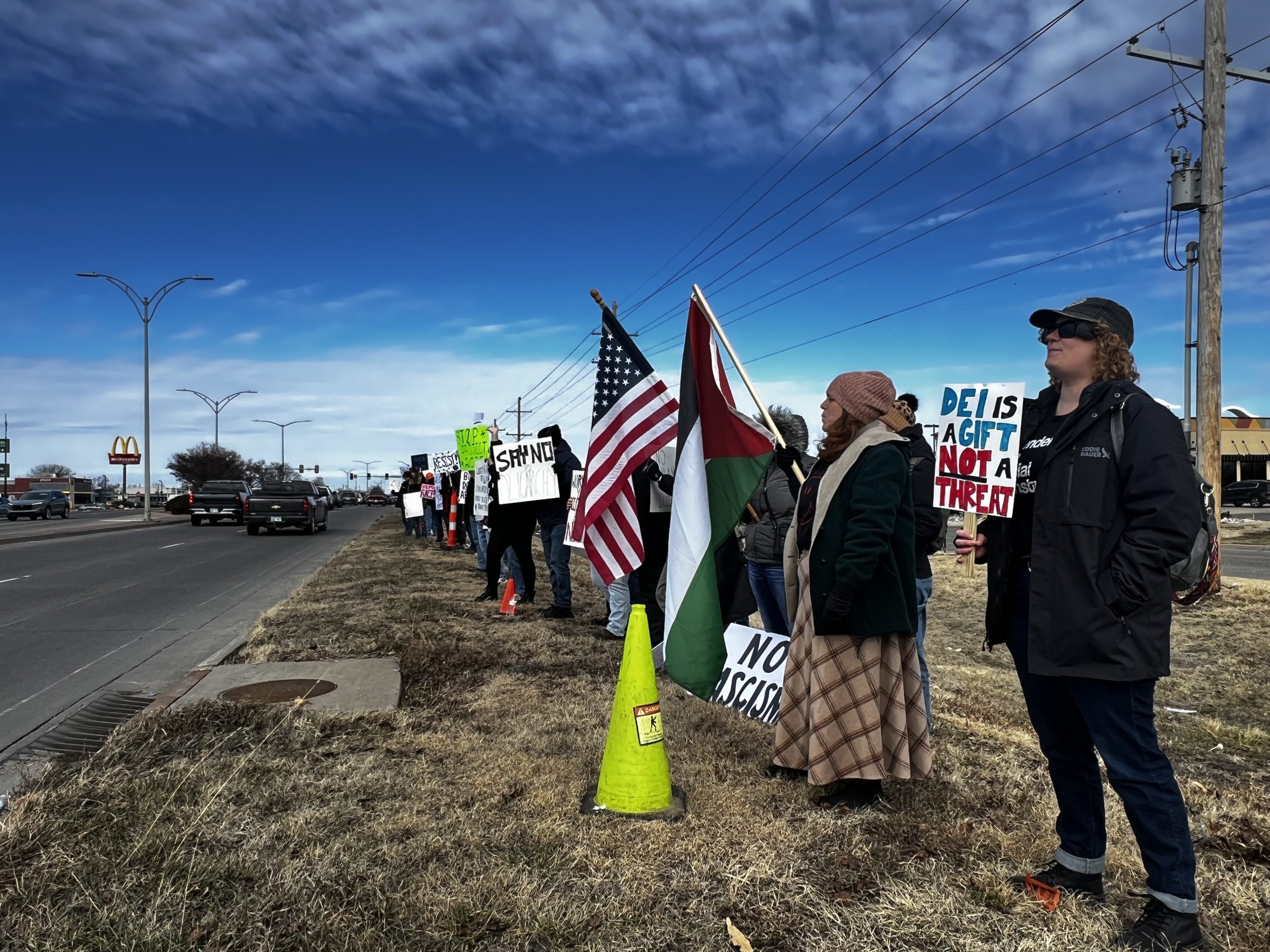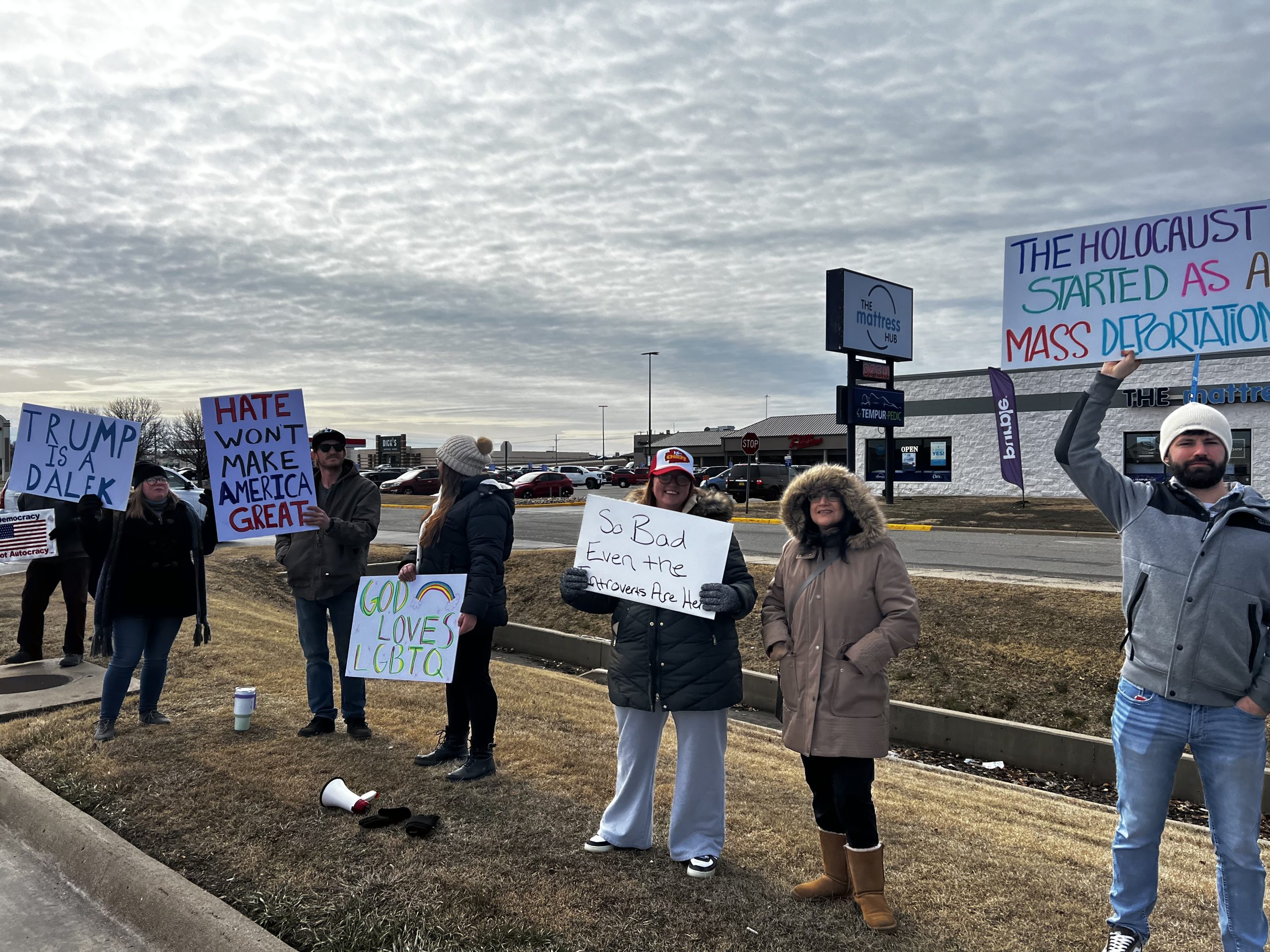 On Sunday afternoon, a crowd assembled on S. 9th St. just a week after a protest that occurred in downtown Salina. Two groups stood on each side of the street as they chanted and held signs. Cars passing by either honked, cheered or opposed the crowd.