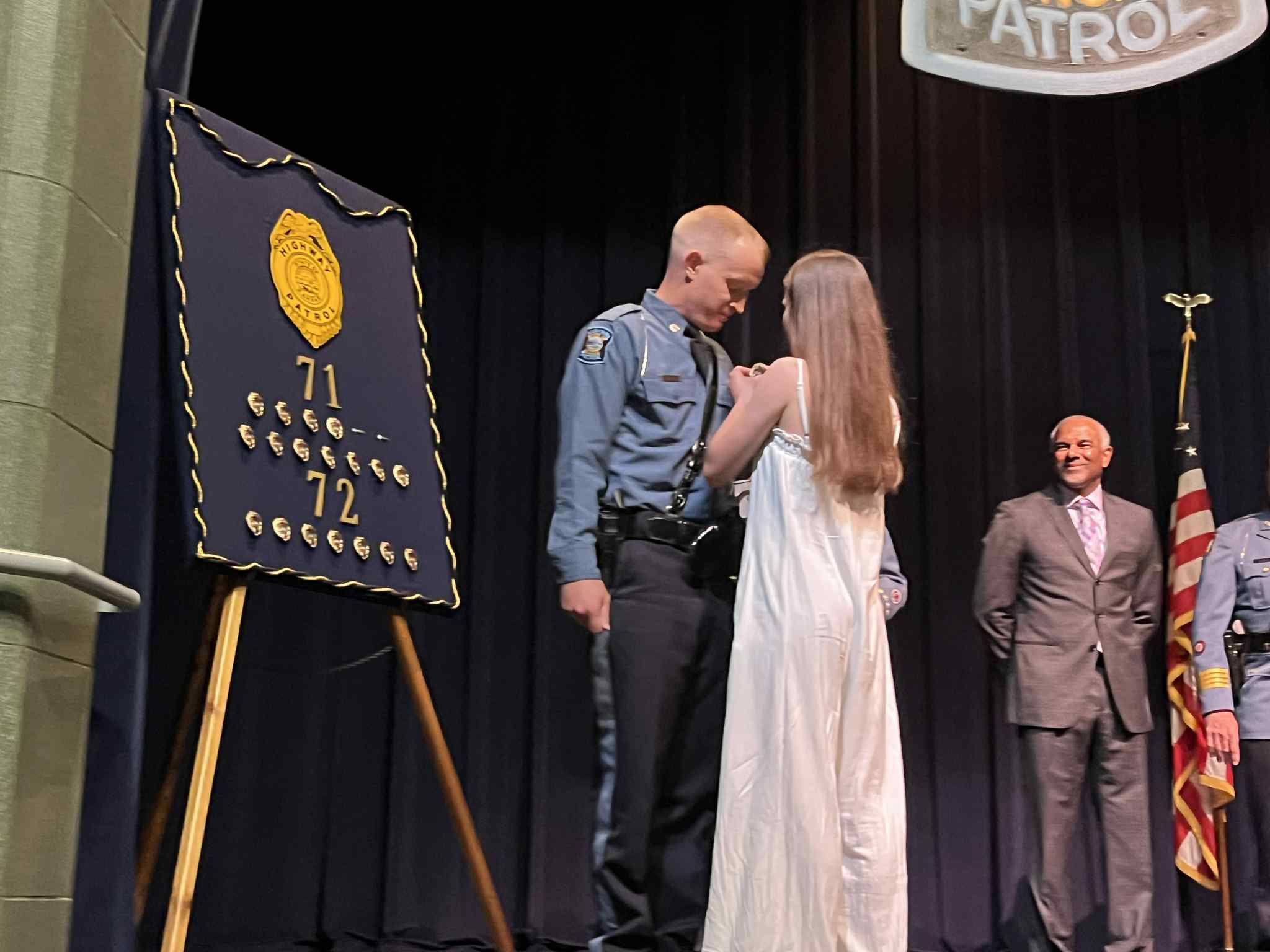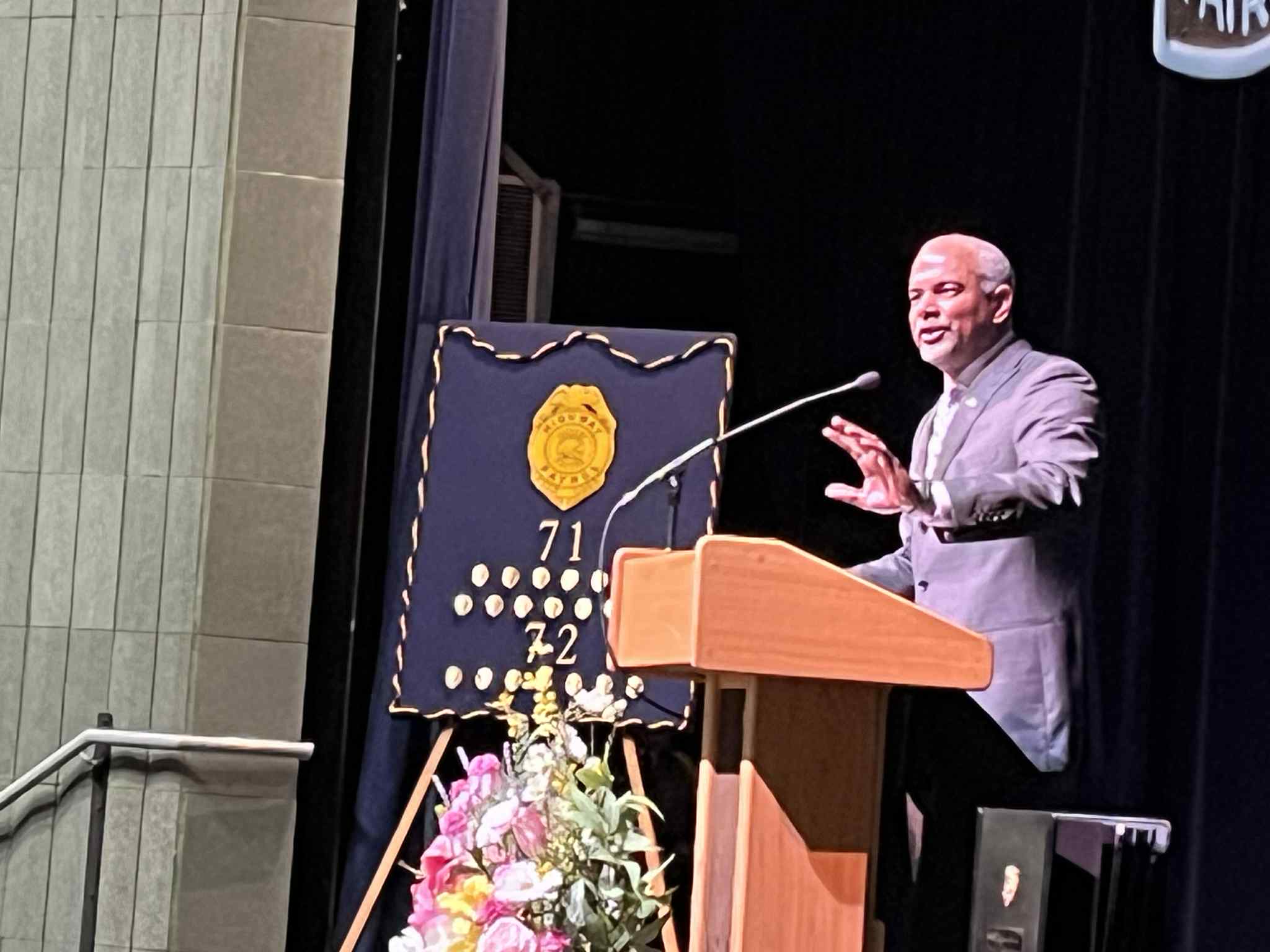 The featured speaker was Kansas State University Basketball Coach Jerome Tang. He told the graduates they are not joining the highway patrol, they are the highway patrol. He commended them for pledging to dedicate to live their lives with integrity, honor, and grit. He said that as the new troopers as they take care of the vulnerable they will see the best in people, and the worst. Tang also thanked the families. He concluded by telling the new troopers to “never forget why you chose this path, and never forget those you serve”.