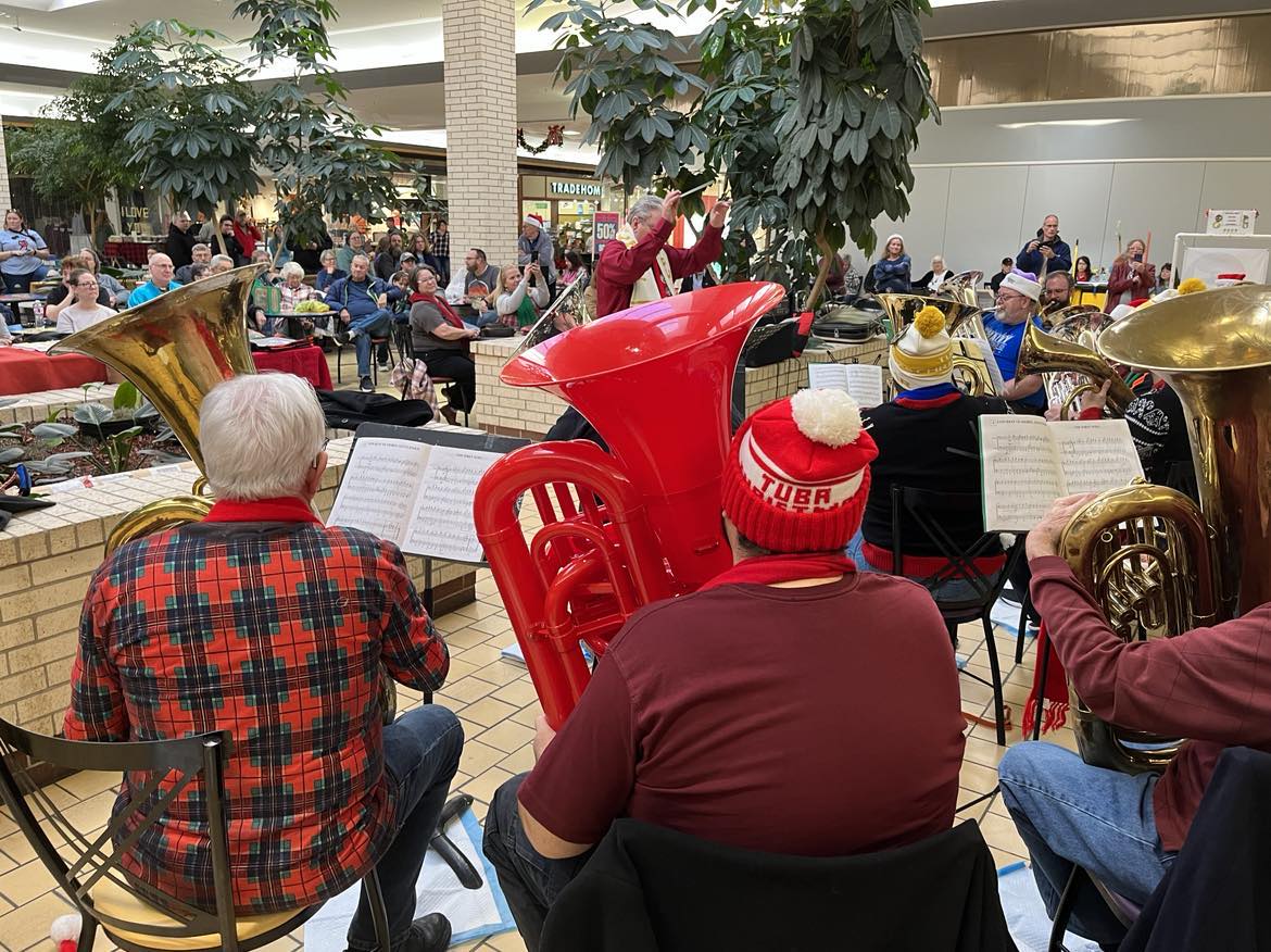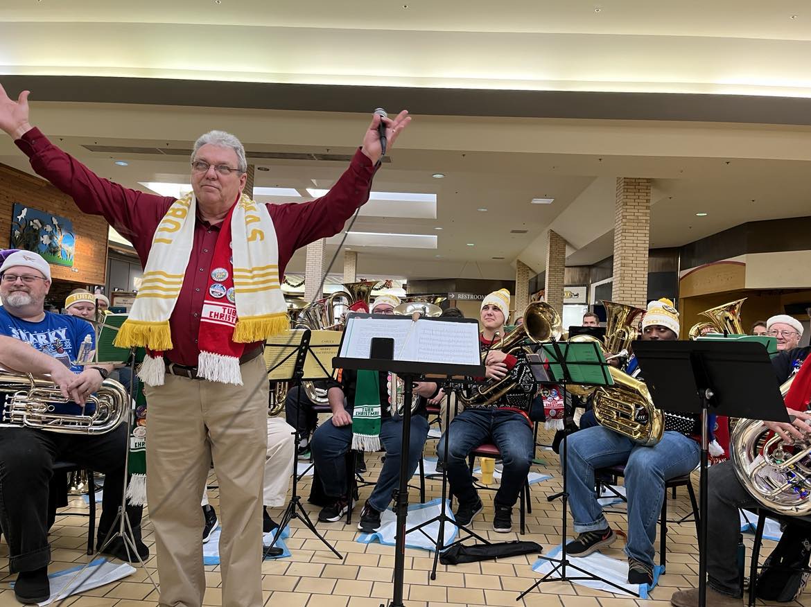 Retired KWU Low Brass Instructor Steve Leuth conducted the Salina “TubaChristmas” ensemble. Following a morning rehearsal area tuba and euphonium players performed at the Central Mall for an hour.