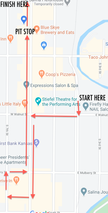That’s right. The wedding party will embark on a route that takes them through several parking lots and streets so anyone wanting to see the bride and groom can do so from the safety and comfort of their own vehicle. Anyone may park along the streets (where allowed) and in the parking lots at the Salina Innovation Foundation or the parking lot north of Ad Astra Books and Coffee. Guests are invited to honk and wave and send their well wishes while observing social distancing practices.